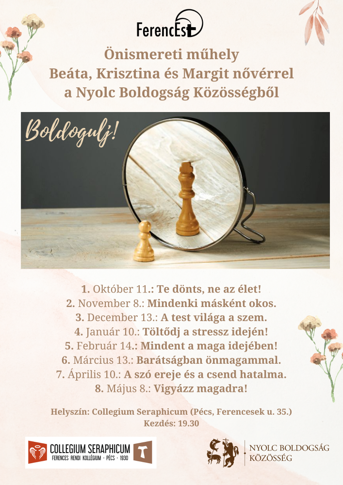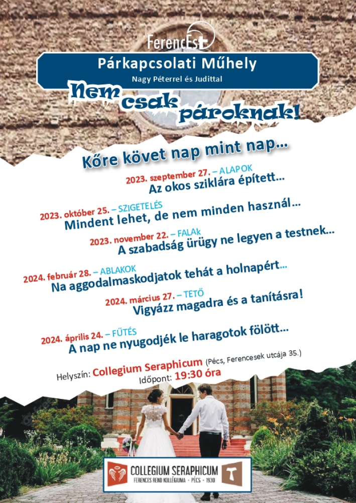 A „Boldogulj” önismereti kurzust a Nyolc Boldogság Nővérek tartják, akik abban szeretnének segíteni a fiataloknak, hogy felfedezzék rejtett kincseiket és megtanuljanak azokkal okosan gazdálkodni. A szó szerinti FerencEsteken Péter és Fülöp testvér párbeszédes formában invitálja az egyetemistákat Szent Ferenc és a ferences rend megismerésére. A párkapcsolat témáit Nagy Péter (a Pécsi Egyházmegye közoktatási munkatársa) és felesége bontja ki „Követ kőre nap, mint nap” jeligére.