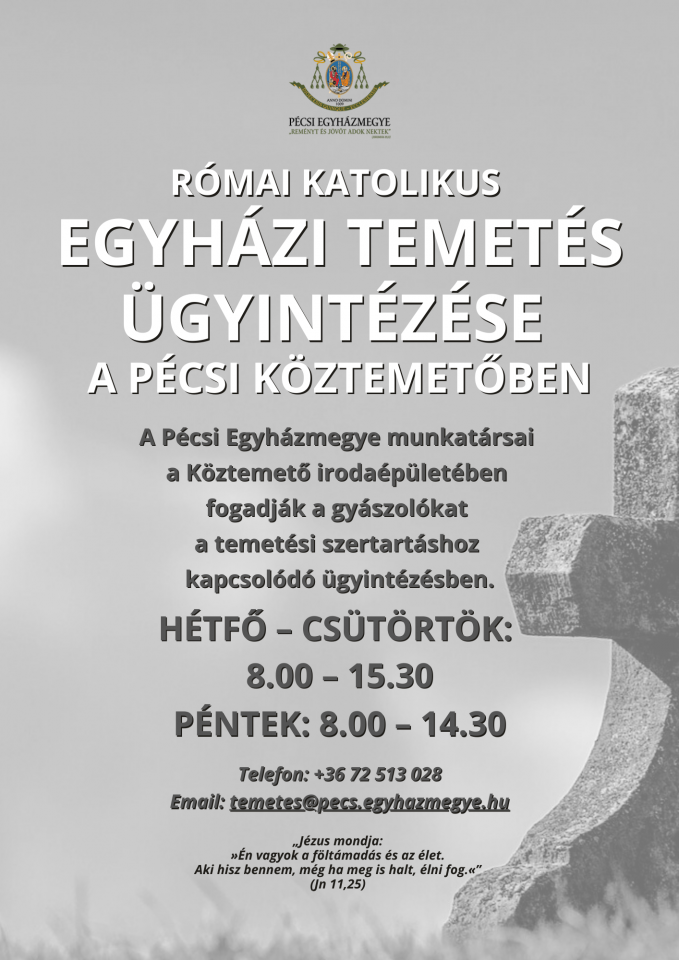 A gyász a legnehezebb időszak egy család életében. A Pécsi Egyházmegyei Hivatal a gyászolóknak kíván segítséget nyújtani azzal, hogy lehetőséget ad a Római Katolikus Egyház szertartása szerinti temetést igénylő hozzátartozóknak a temetői irodaépületben történő ügyintézésre.