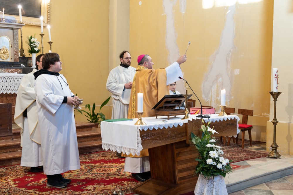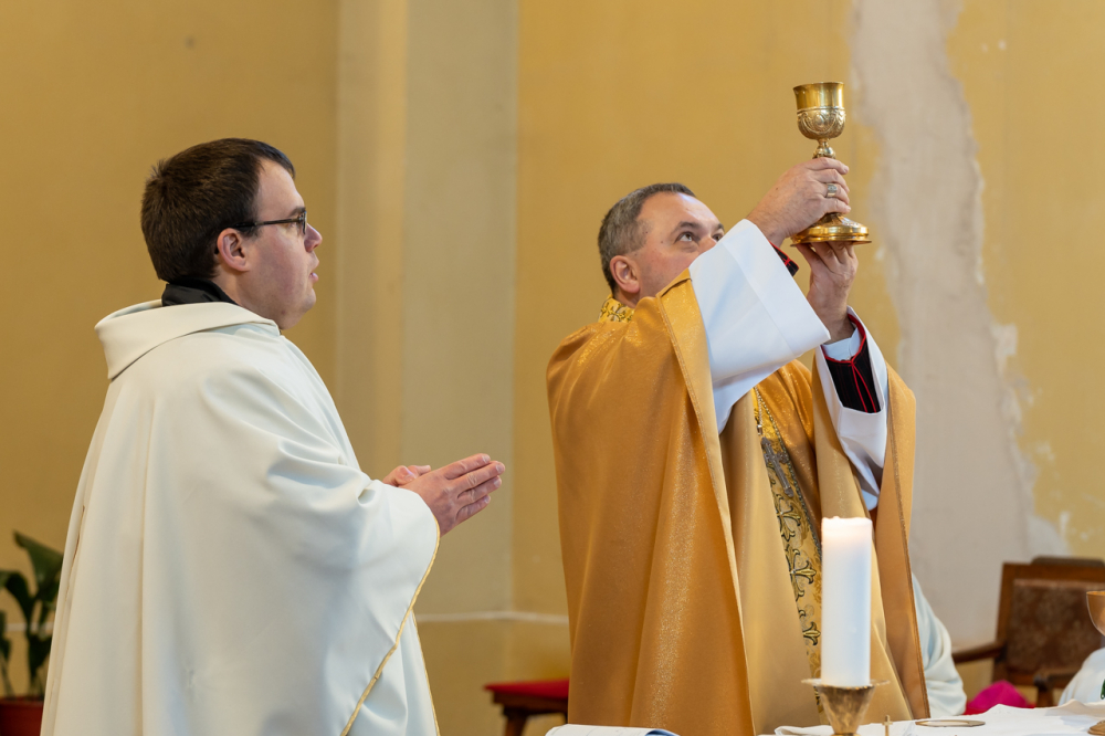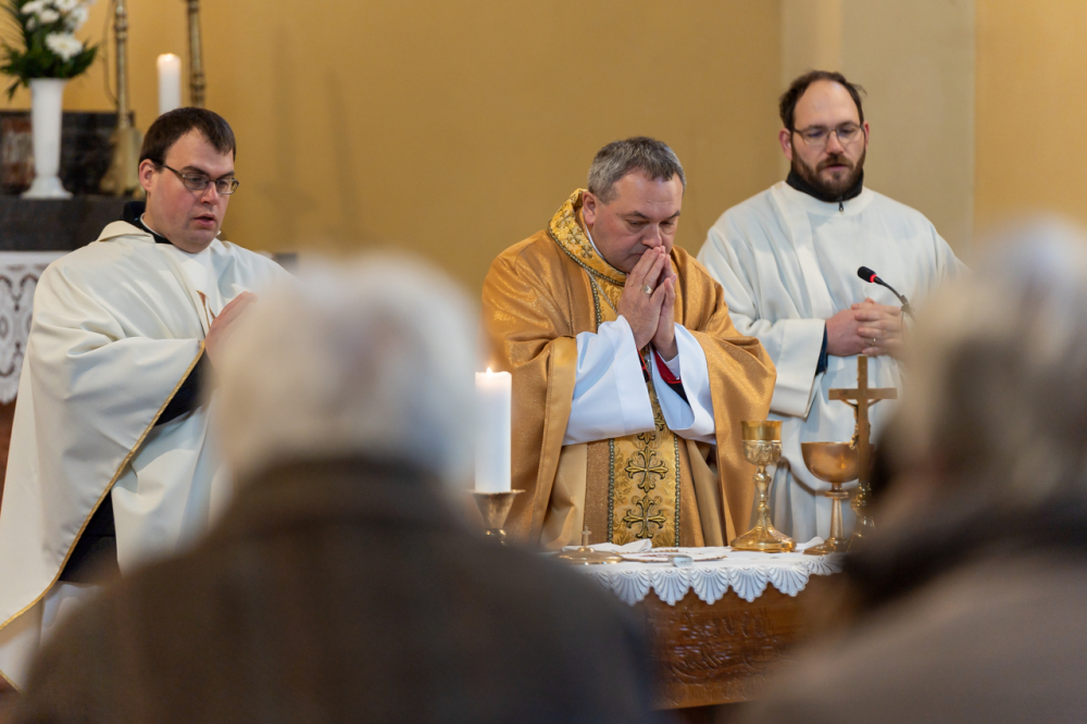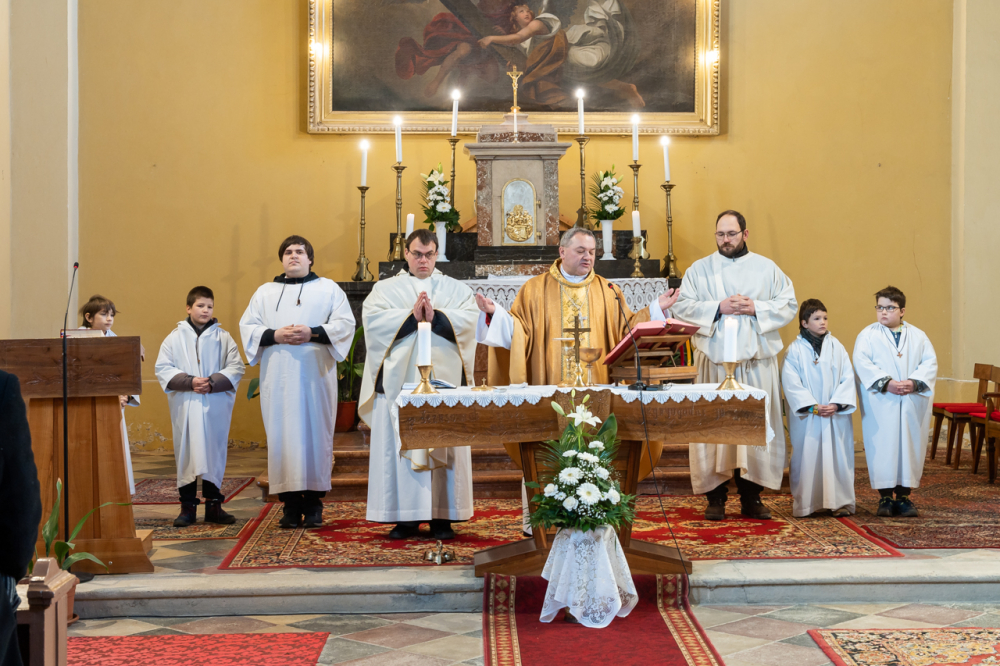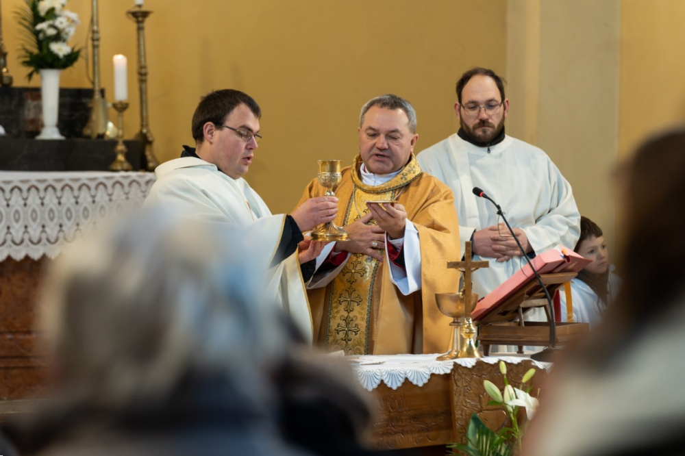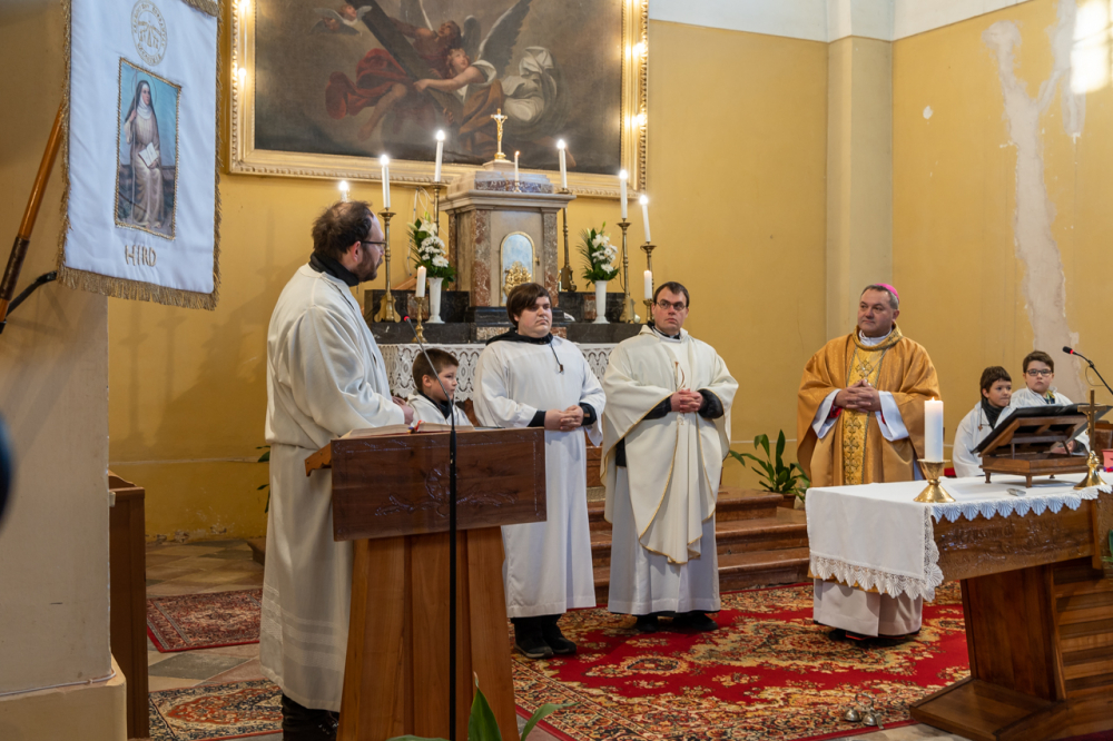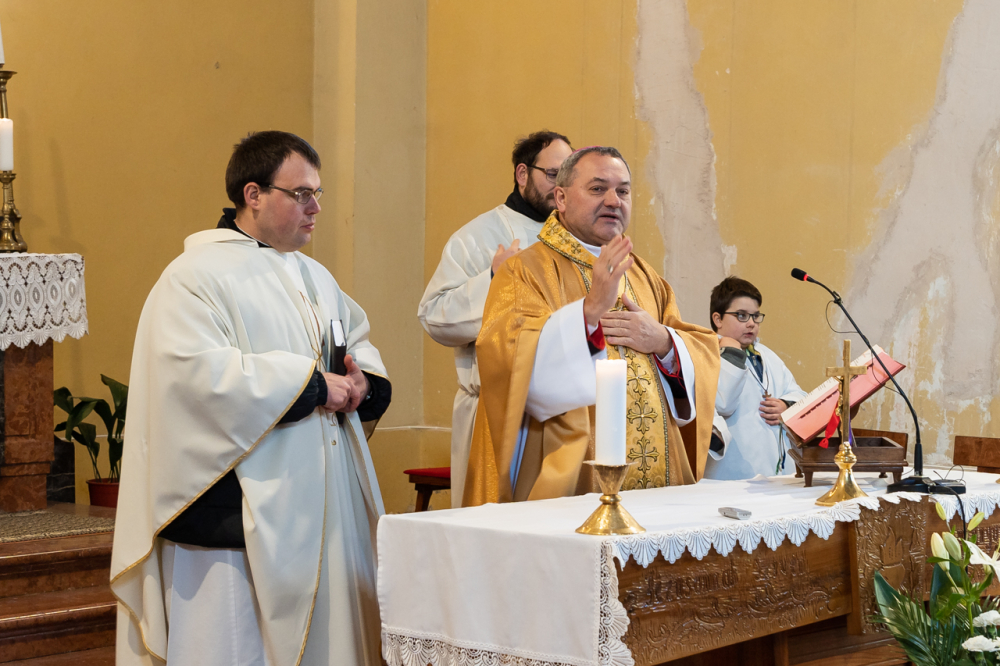 Lovász Zsolt plébános köszönetét fejezte ki a főpásztornak a Pécsi Egyházmegye támogatásáért, melynek köszönhetően a közösség újra saját templomában ünnepelheti a szentmiséket. Az előzményekről szólva elmondta, az épületet 2019-ben statikai okok miatt bezárták. A Covid19-járvány idején a templomban a liturgiák szüneteltek, majd 2021-ben a helyi református közösség temploma fogadta be a szentmiséket.