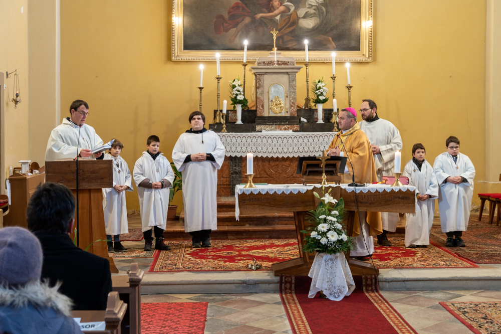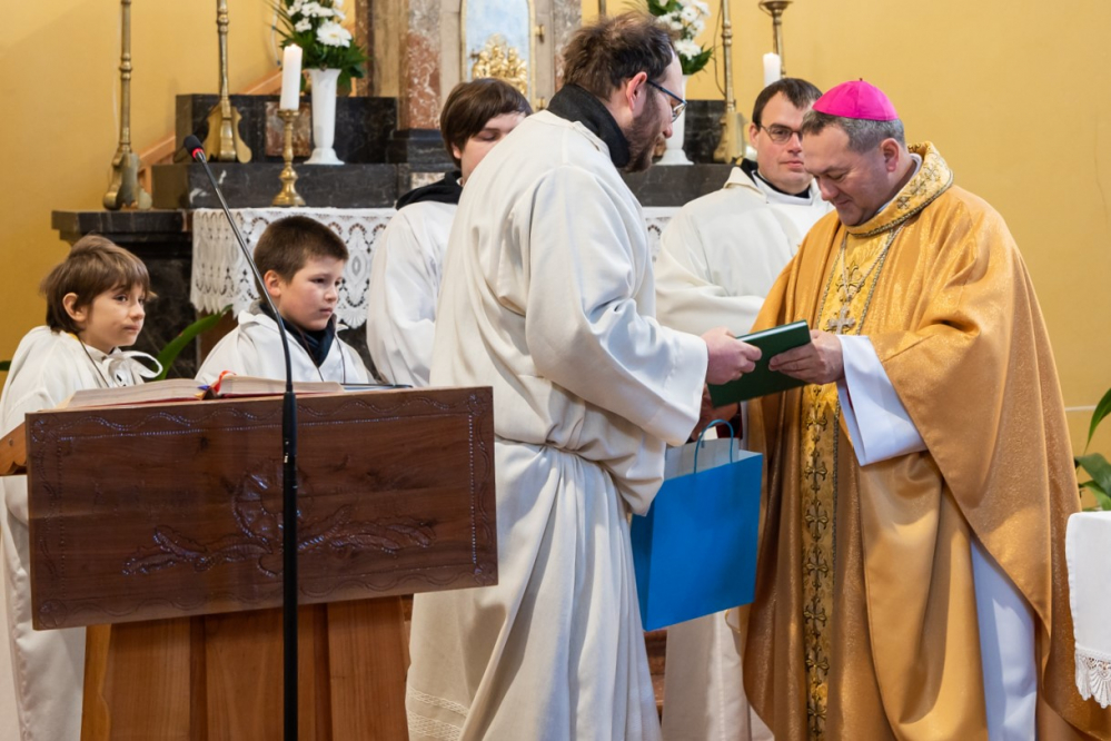 Az egyházközség képviseletében Vasvári Gyula köszöntötte a főpásztort, majd átadta a közösség ajándékát, iskolások és óvodások munkáját, a templom egyik freskójáról készített színes alkotást.