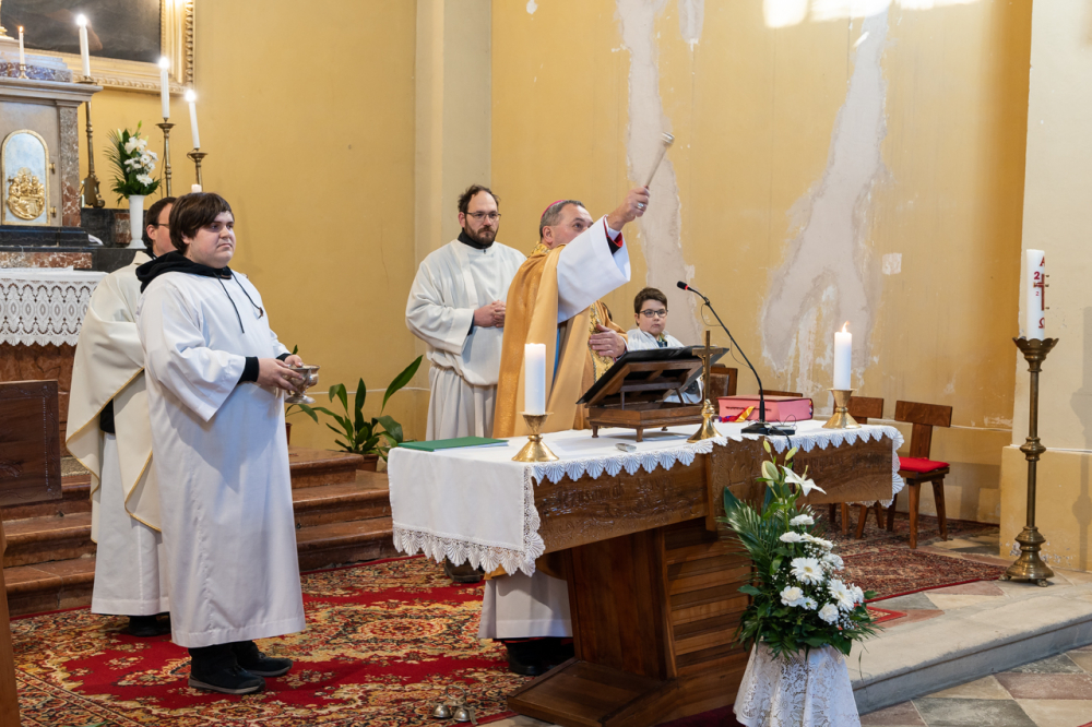 Egy család, egy közösség élete éppen olyan, mint egy templomépület története - emelte ki a szentmise homíliájában a püspök. Felépül, működik, aztán valaminek a hatására meginog, ezért meg kell erősíteni, meg kell húzni az összekötő szeretetszálakat. Ez történt közösségeinkkel, ez történt az Egyházzal. Nekünk jutott az a feladat, hogy találjuk ki, hogyan erősítsük meg és találjuk meg azt az utat az életünkben, melyen a ránk bízott krisztusi közösséget élővé tudjuk tenni. Ehhez ki kell venni mindenkinek a maga részét, szolgálatát, amit jó szívvel és örömmel hozzá tud tenni a közössége szolgálatához.