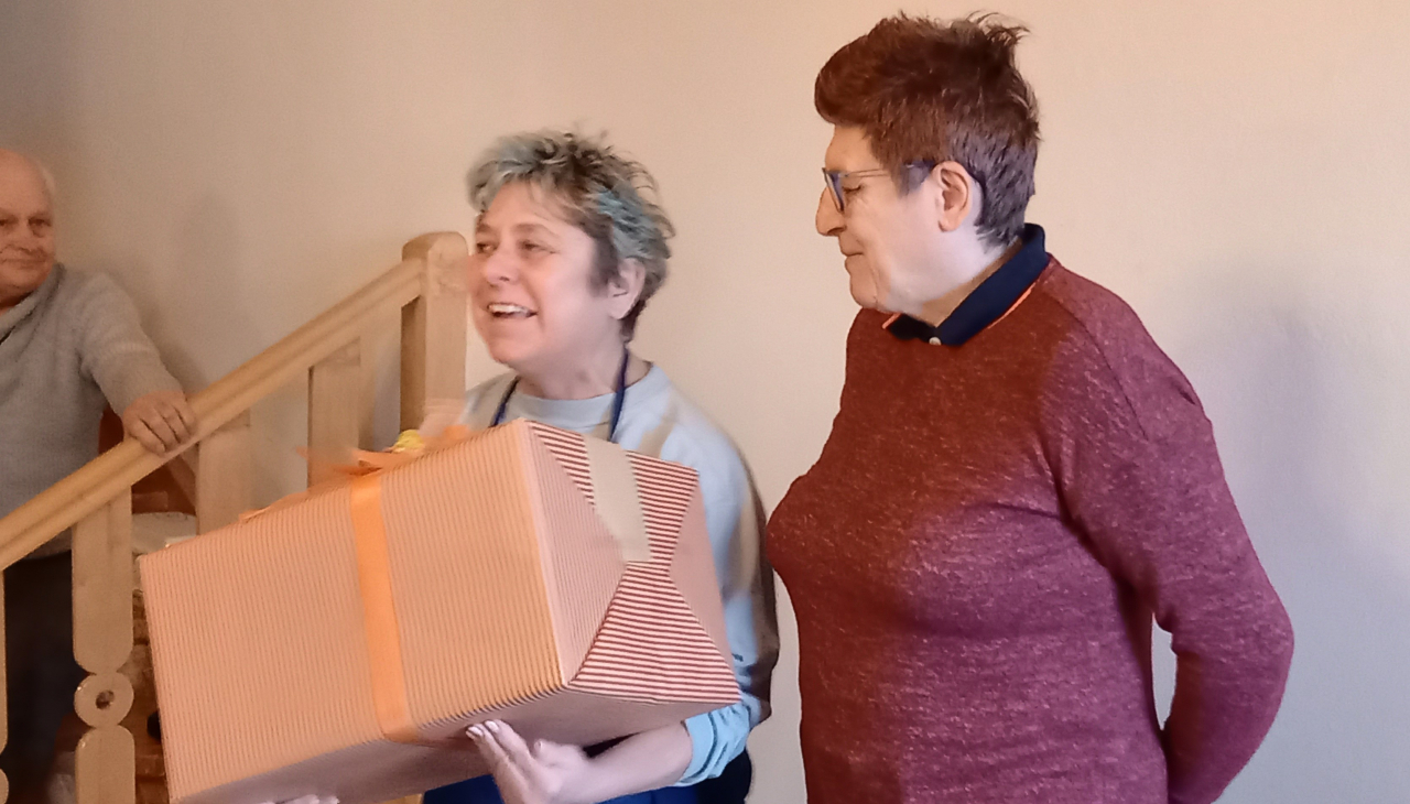 Julika még mindig nem sejtett semmit, így amikor a ceremónia megkezdődött, nem értette, hogy miért áll vele szemben Bea mosolyogva, egy nagy dobozzal a kezében, mellette pedig Hesz Zoltánné Jolika a máltai csoport vezetője. Az ajándék különösen jólesik az embernek, ha van körülötte szerető közösség, akik szívből adják. Könnyek és csókok váltották egymást, az ajándék pedig gazdára talált. Volt, aki dalra fakadt, Végh Imre bácsi szép hangjával megáldva fokozta a jókedvet. Természetesen a finom étel sem maradt el, így lélekben és testben megerősödve tudhattuk magunk mögött ezt a szép napot.