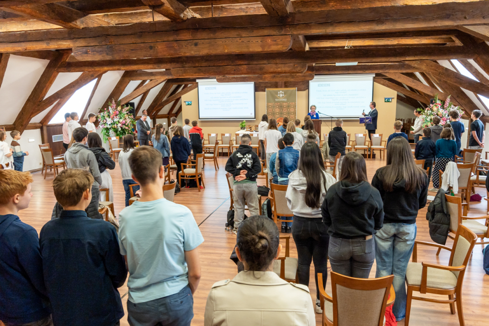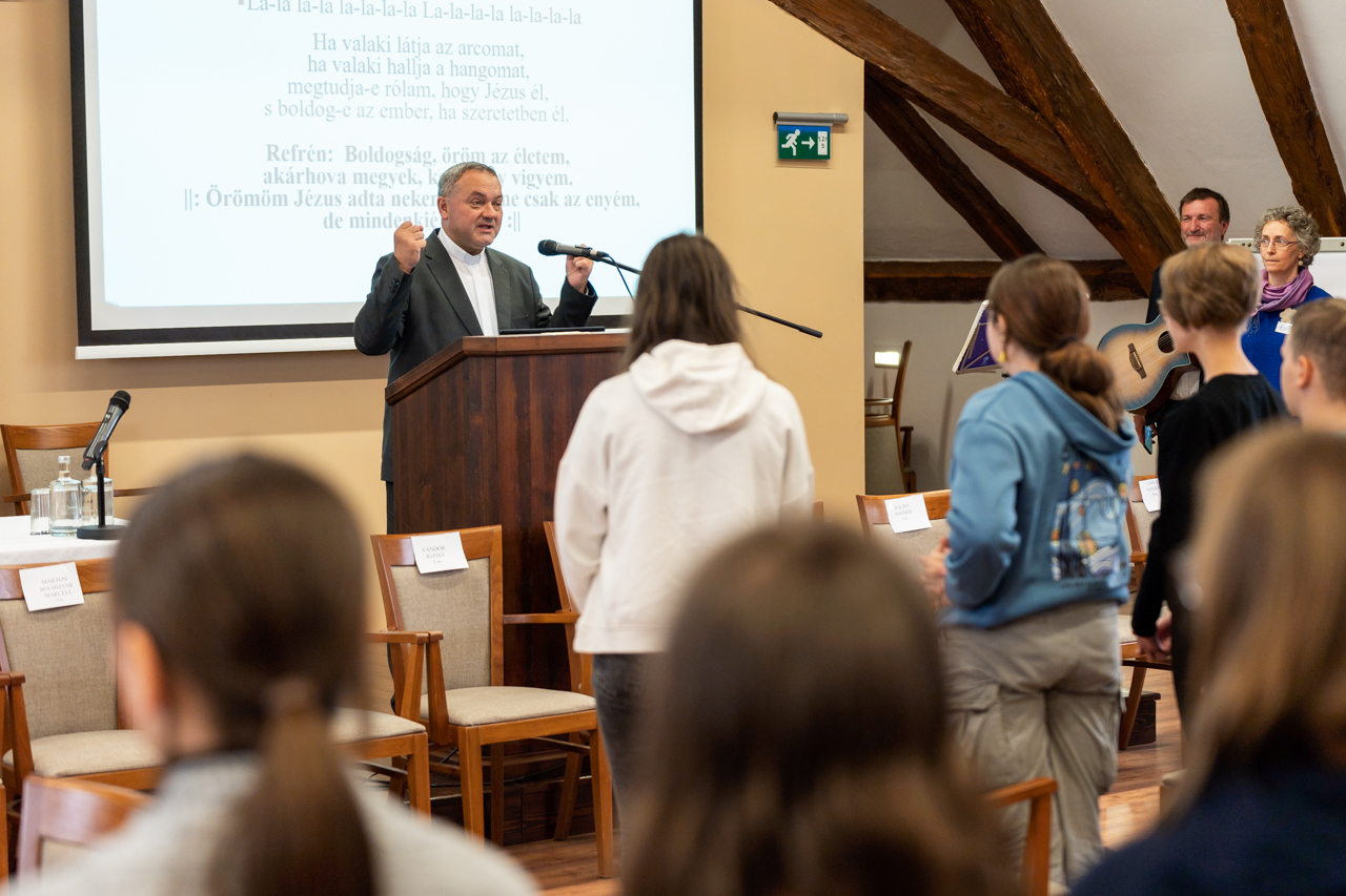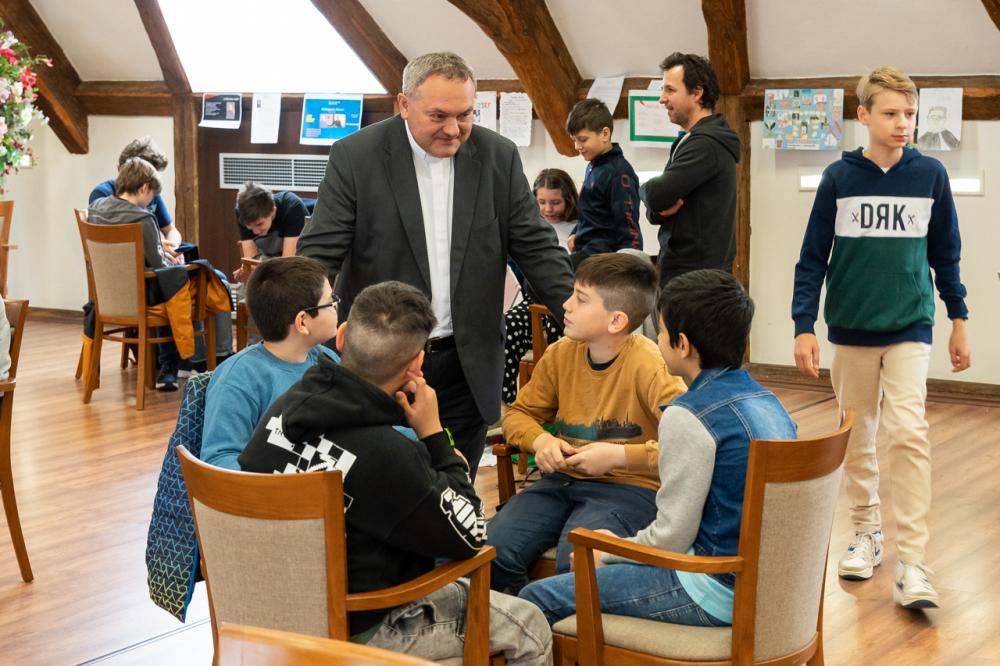 Meglátogatta a résztvevőket Felföldi László pécsi megyéspüspök is, aki rövid beszélgetést követően kifejezete örömét az élményért, amit a gyerekekkel való találkozástól kapott, majd a Jóisten áldását kérte a versengésre, ahogy fogalmazott: „Isten áldása legyen veletek, értetek és rátok”.