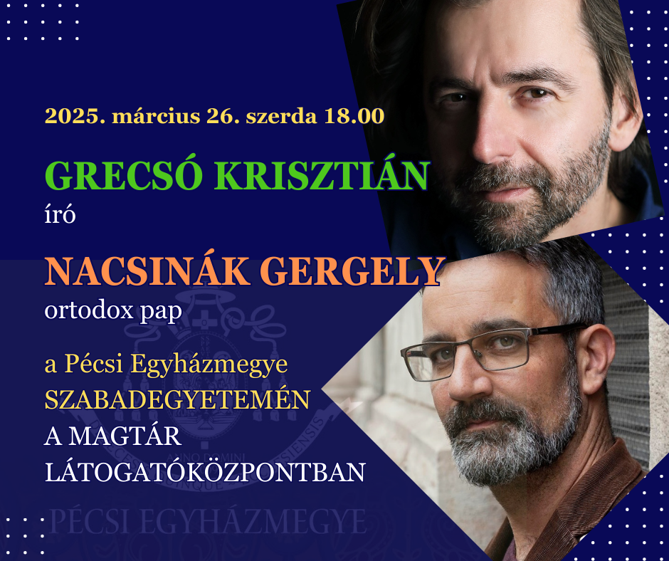 A Pécsi Egyházmegye szabadegyetemi sorozata Grecsó Krisztián író és Nacsinák Gergely teológus közös előadásával folytatódik március 26-án, 18.00 órai kezdettel a Magtár Látogatóközpontban.