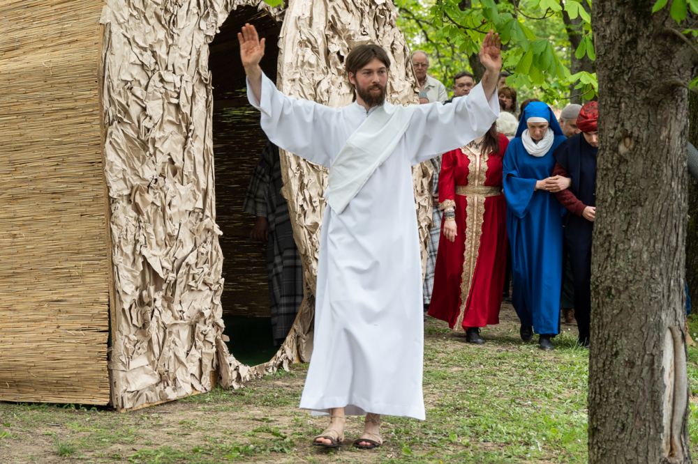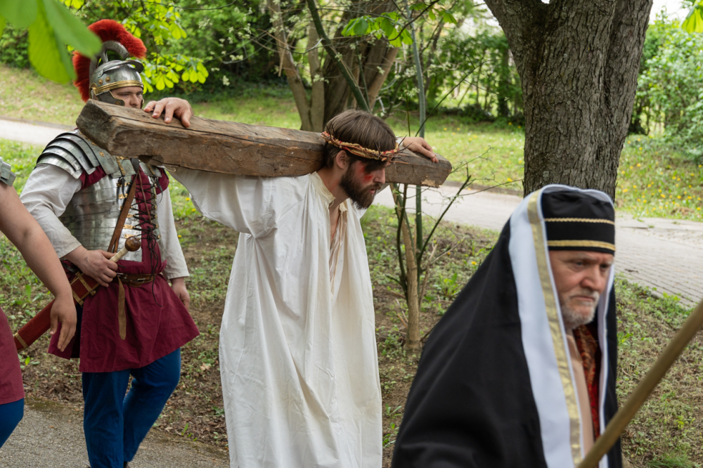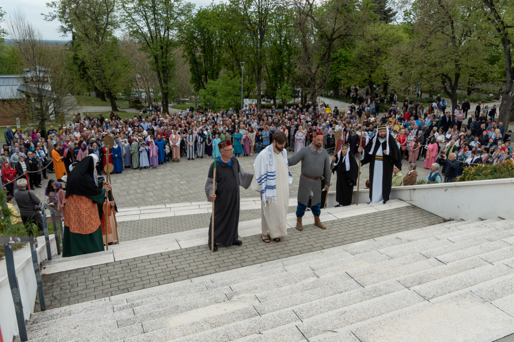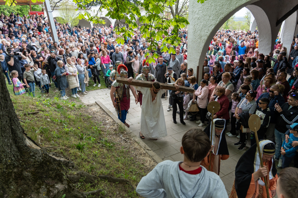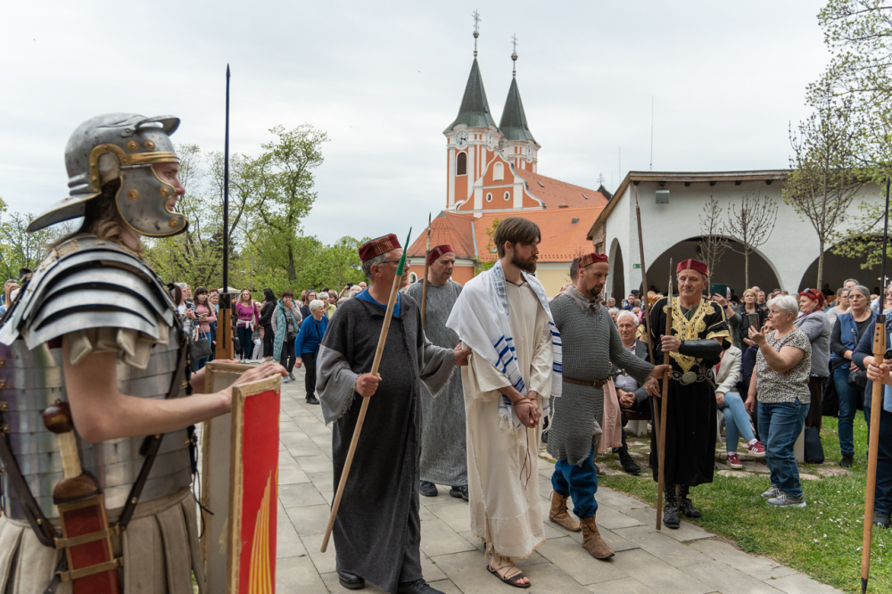 A Sarlós Boldogasszony-kegytemplomot körülvevő festői kegyhelyen megjelenített passióban a főpásztor Cirenei Simont, a plébános az első farizeust, Polgár Péter kántor pedig Poncius Pilatus római helytartót alakította. Jézust Nádudvary Csongor, a közösség tagja személyesítette meg.