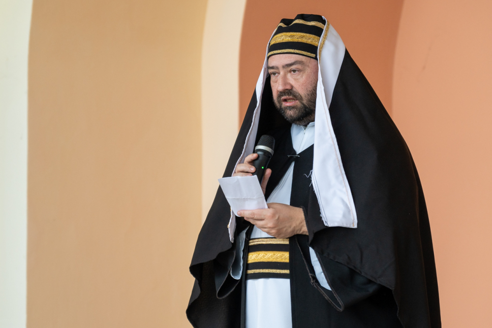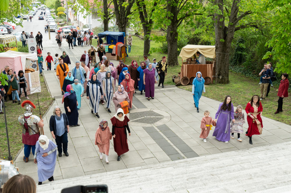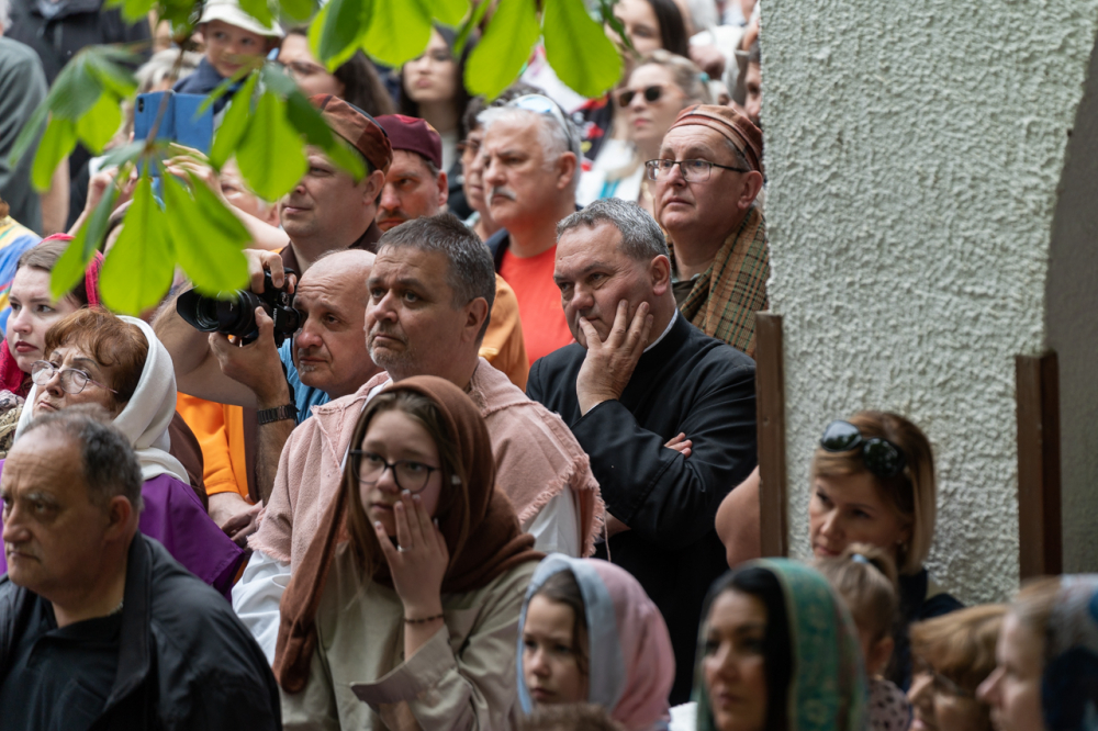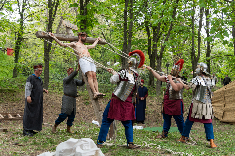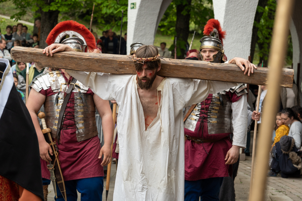 A Sarlós Boldogasszony-kegytemplomot körülvevő festői kegyhelyen megjelenített passióban a főpásztor Cirenei Simont, a plébános az első farizeust, Polgár Péter kántor pedig Poncius Pilatus római helytartót alakította. Jézust Nádudvary Csongor, a közösség tagja személyesítette meg.