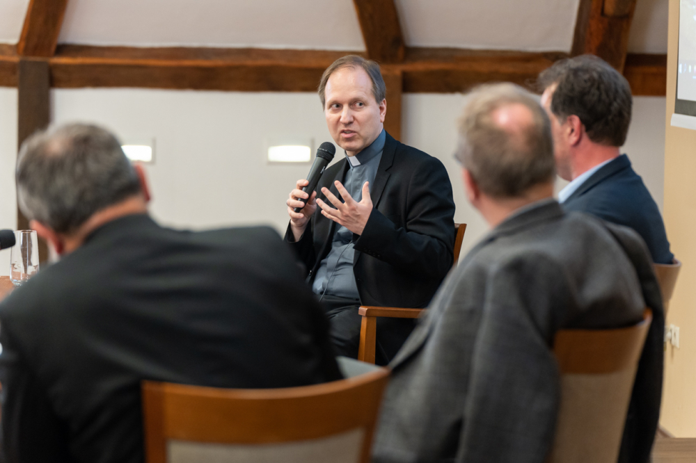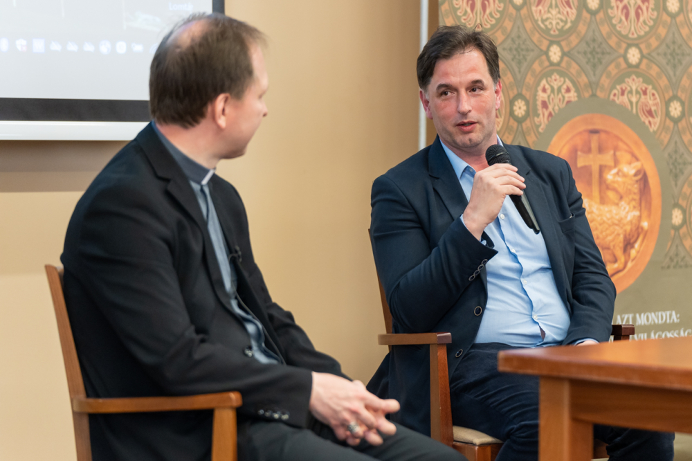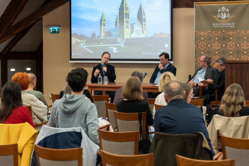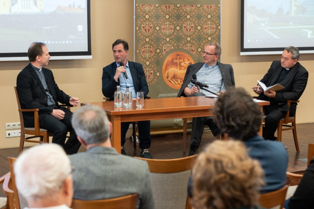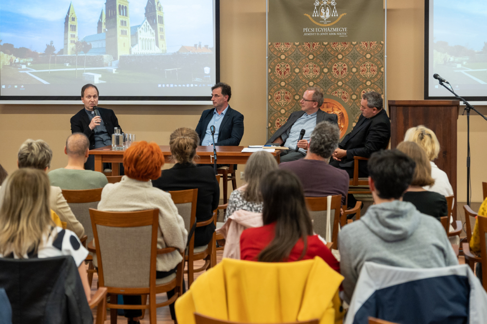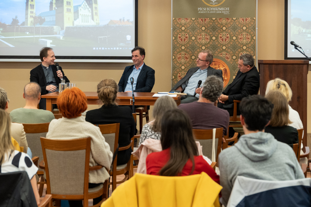 Az előadást pódiumbeszélgetés követte, melyen az előadó mellett részt vett Felföldi László pécsi megyéspüspök, Forrai Tamás SJ egyetemi lelkész, valamint a beszélgetés moderátora és a program házigazdája, Görföl Tibor teológus.