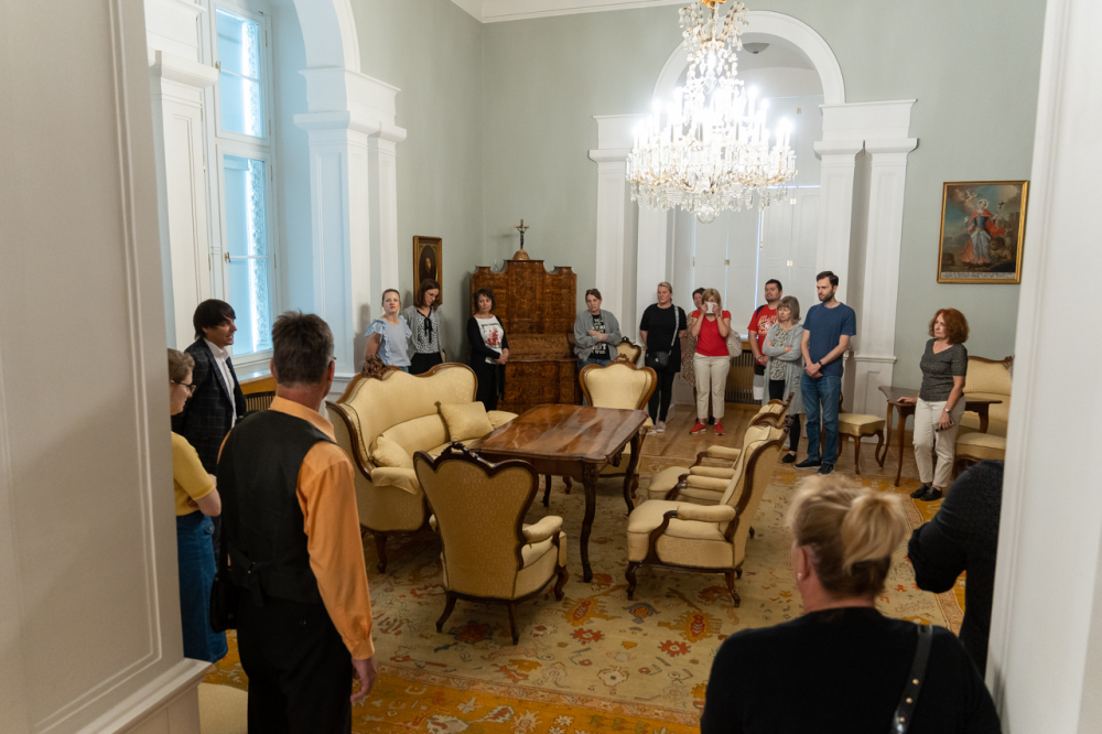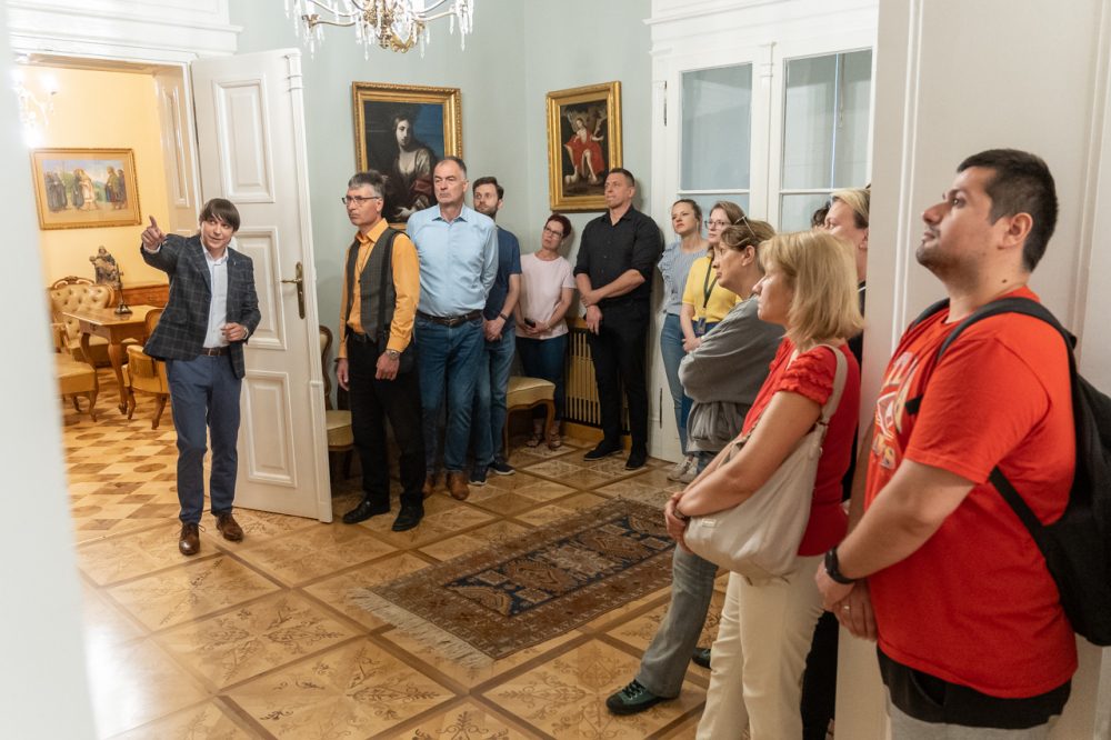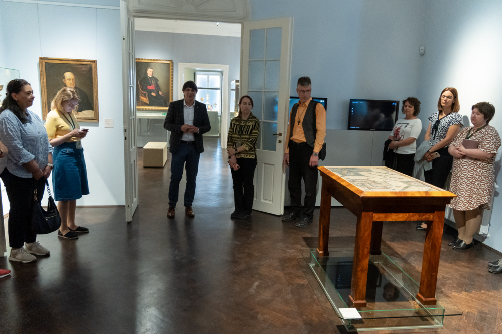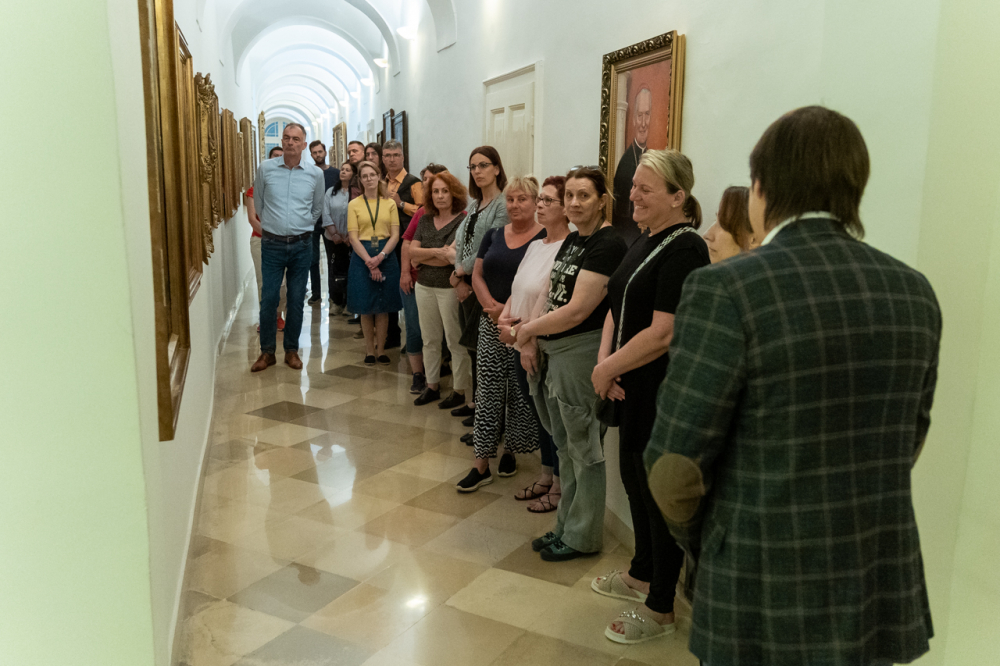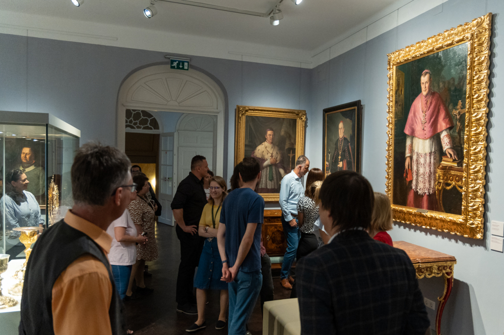 A látogatás első állomása a XII. században épült alapokon nyugvó püspöki palota látogatható turisztikai szárnyába vezette a hivatal munkatársait, akik a Pécsi Egyházmegye korábbi püspökeinek életébe nyertek bepillantást az általuk használt korabeli szalonokon, használati eszközökön és a falakon látható olajfestményeken keresztül.