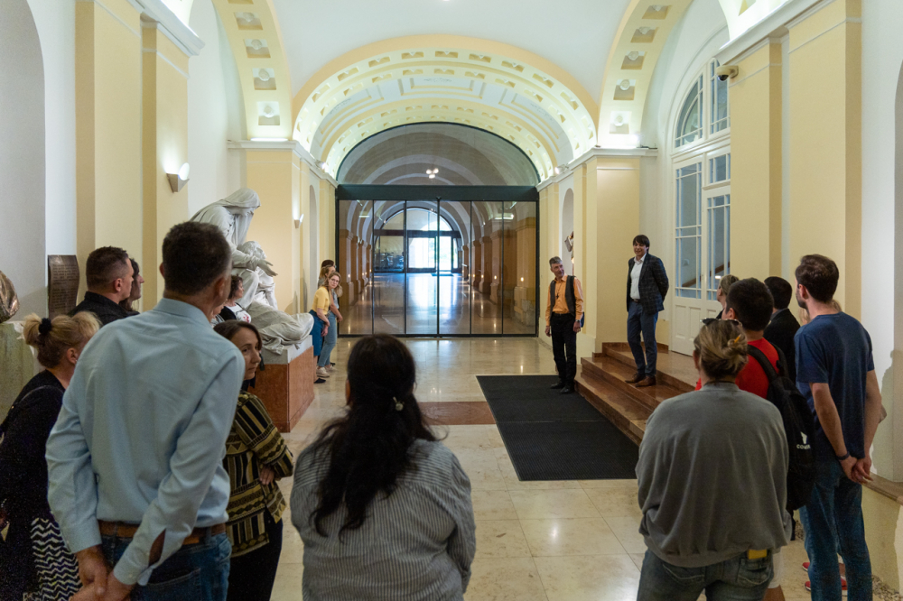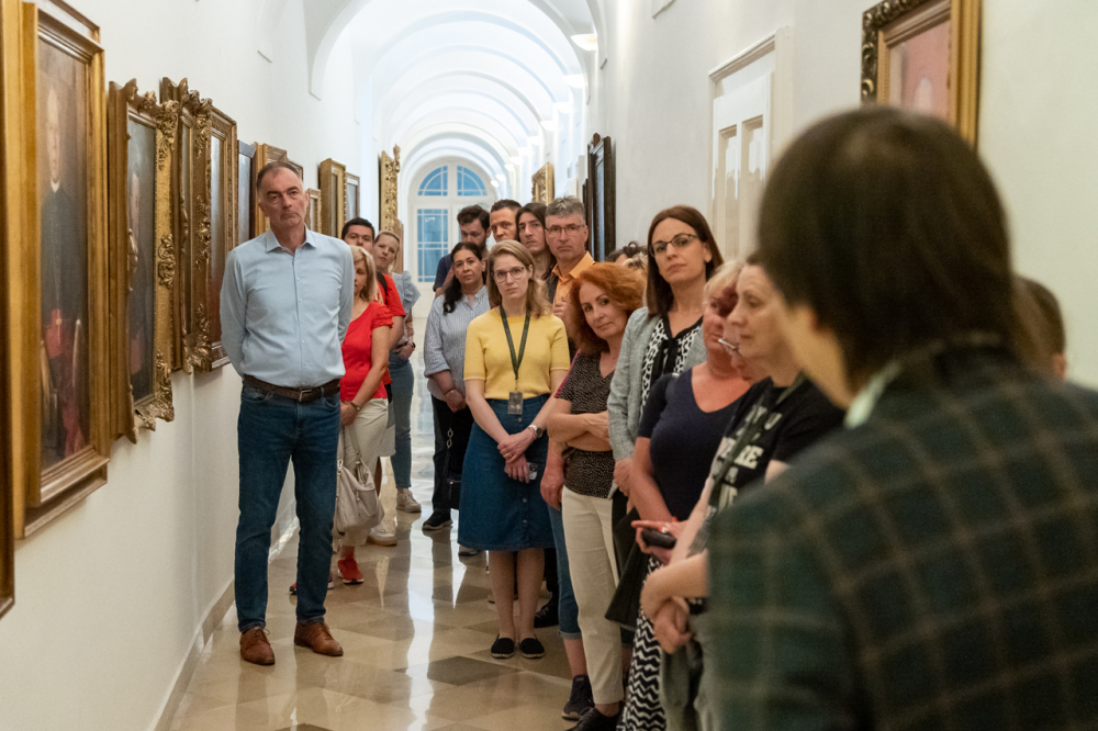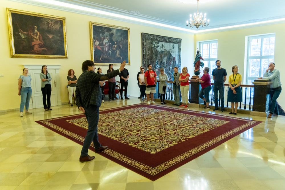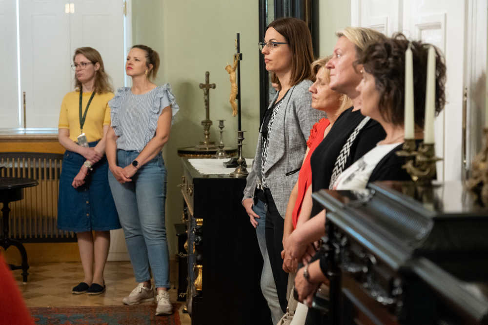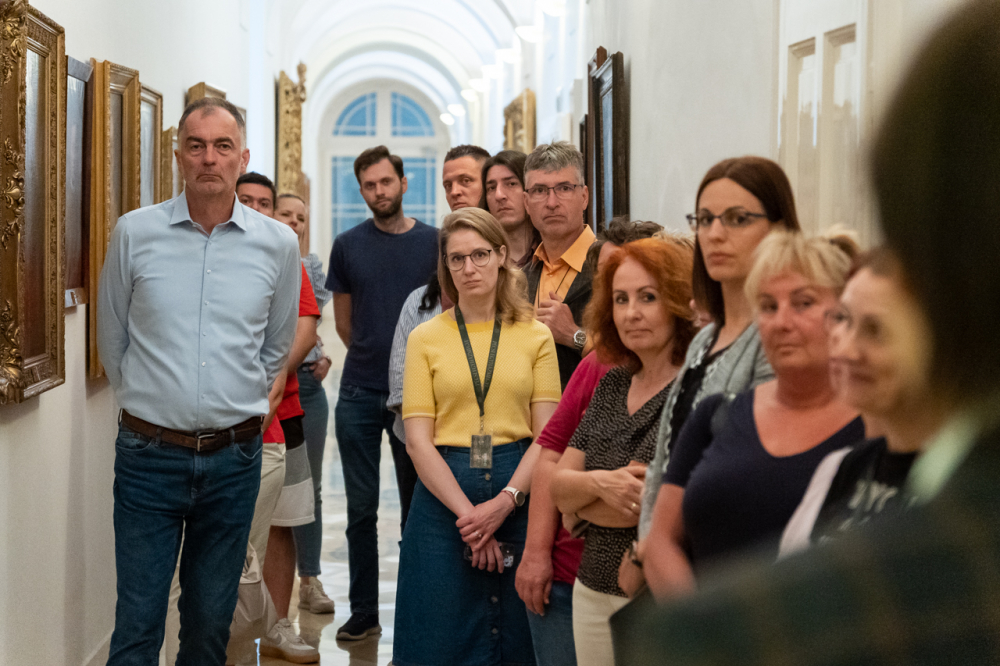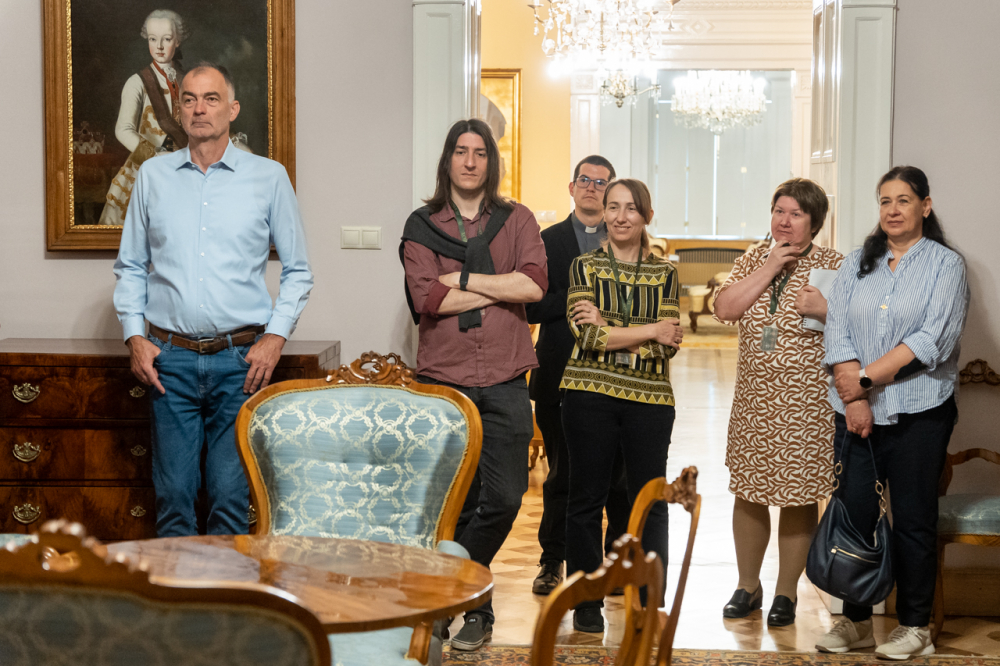 A látogatás első állomása a XII. században épült alapokon nyugvó püspöki palota látogatható turisztikai szárnyába vezette a hivatal munkatársait, akik a Pécsi Egyházmegye korábbi püspökeinek életébe nyertek bepillantást az általuk használt korabeli szalonokon, használati eszközökön és a falakon látható olajfestményeken keresztül.