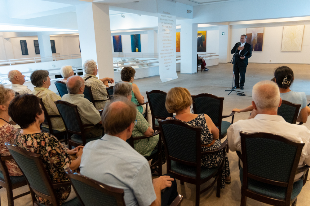 Hegyi Csaba festőművész, egyetemi tanár a kiállításon bemutatott alkotások méltatásában arról beszélt, hogy a művész a sok kép közül, melyek az élete során a Miatyánk imádsághoz kapcsolódóan a fejében megszülettek, most megmutat néhányat. A kép, a festészet és a művészet hatalma abban áll, hogy amit a művész megmutat nekünk, segítségünkre lehet abban, hogy az imádság szavai bensőnk csöndjében még jobban hallhatók és érthetők legyenek, és formálódjanak.