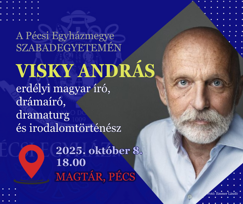 A Pécsi Egyházmegye szabadegyetemi sorozatának újabb epizódjában Visky András erdélyi magyar íróval találkozhatnak az érdeklődők október 8-án, 18.00 órai kezdettel a Magtár Látogatóközpontban. A beszélgetés moderátora, egyben a sorozat állandó házigazdája Görföl Tibor teológus.