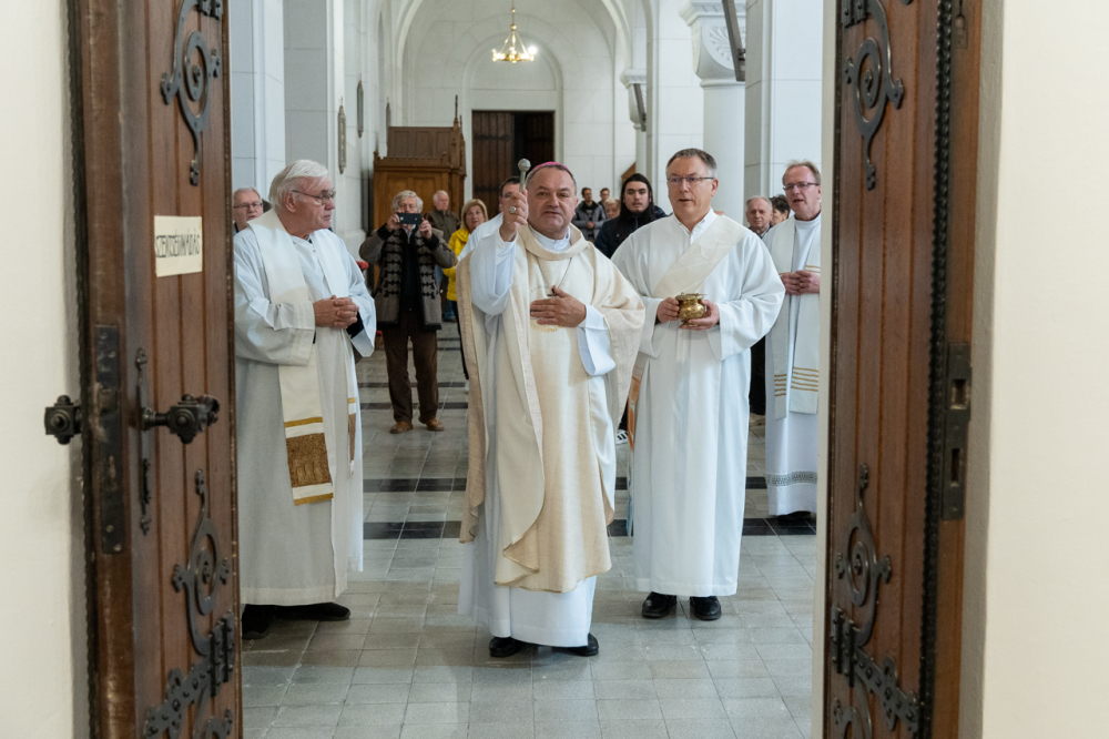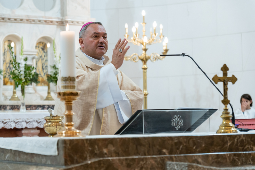 Felföldi László pécsi megyéspüspök köszöntőjében kifejezte reményét, hogy a plébániai közösség csoportjai szívvel, lélekkel és lelkesedéssel töltik majd be a megújult tereket, melyek, mint szentbeszédében utalt rá, sokáig betöltötték rendeltetésüket, de egy idő után méltatlanná vált az állapotuk. Ilyen az életünk és ilyenek az emberi kapcsolataink is – fogalmazott, majd hozzátette, gyönyörű elindulást követően rátelepszik a hétköznapok szürkesége és sebzettsége, az állapota méltatlanná válik hozzánk. Ekkor következik el a megújulás szükségessége, ami nem azt jelenti, hogy valami teljesen újat kezdünk, hanem a múlt stabilitására alapozva kezdjük meg az újnak, a jövőnek, a jobbnak, a többnek a megvalósítását.