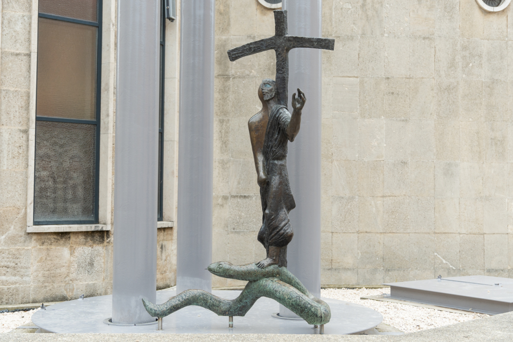 A harangláb tövében Szent Bertalan apostol szobrát, Rétfalvi Sándor Munkácsy Mihály-díjas szobrász, érdemes művész alkotását helyezték el, mely a XIII. századi templom védőszentjének állít emléket.