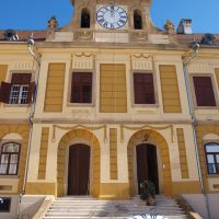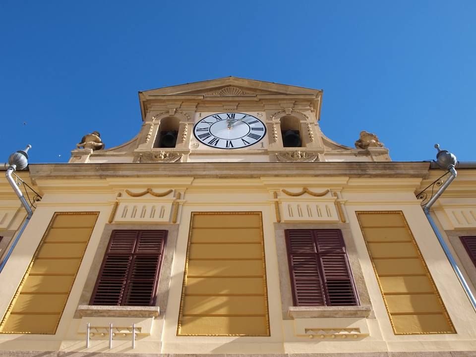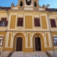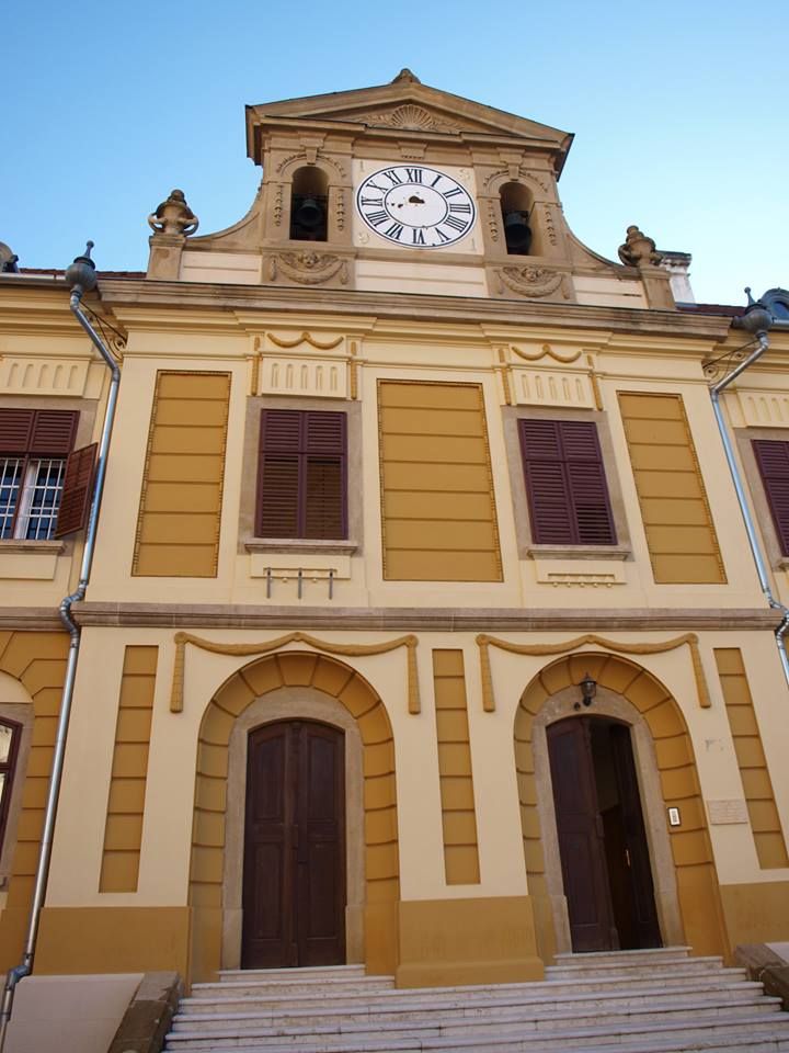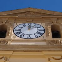 A levéltári épület főbejárata feletti harangfülkés oromzat, amelynek helyén korábban egyszerű timpanon volt, 1891-ben, a pécsi székesegyház átépítésének utolsó évében készült. A Pollack Mihály tervei alapján a 19. század első felében átépített székesegyház mind a négy tornyán feketeszínű, arany számbetűs óralapok voltak, amelyek a későbbi, 1882 és 1891 között zajló felújításkor lekerültek. Az óralapokból egyet megőriztek, s a levéltári épület oromzatán adtak neki helyet. A most leszedett óralap nem 1891-ben került fel: azóta azt már többször kicserélték, legutóbb az 1960-as években.
