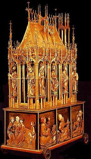 Ugyancsak ekkor készült a közel 60 cm magasságú gótikus ereklyetartó is. Az áttört karimájú gótikus talpból emelkedik ki a nyél, amelyen két nodus között felnyúló oszlopokkal kerített, s kereszttel díszített apró fülkék láthatók. A felső gömbből kinyúló talapzaton nyugszik a négyszögű, keretbe foglalt kristály tok, amelyet drágakövekkel, s apró gyöngyökkel díszítettek. Ebben van az ereklye, egy nagyon vékony, ritkás szövet, alig látható foltokkal, a Szent Vér nyomaival. Az ereklyetok mellett két, fülkékkel, csúcsokkal díszített, s karcsú csúcsokban végződő oszlop, a fülkékbe helyezett apró alakokkal. Az ereklye fölött félgömb alakú alapon nyugvó, három osztatú torony, gúla alakú hosszú csúcsán kereszt volt. E tornyot is apró fedeles fülkék díszítették, kicsi szobrokkal. Az ereklyetartót Rudnay Sándor prímás 1829-ben restauráltatta, s az ereklyetokot úgy illesztette be a monstranciába, hogy az abból kivehető és a híveknek csókolásra nyújtható legyen.