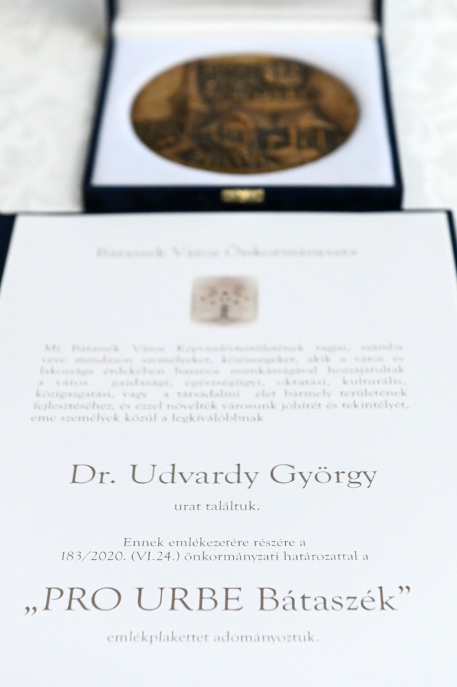 Elévülhetetlen érdemeinek elismeréseként Bátaszék városa Pro Urbe díjjal tüntette ki Udvardy György veszprémi érseket, pécsi apostoli kormányzót.