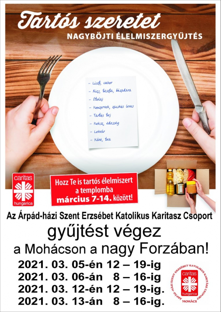 2021-es évben a nagyböjti tartósélelmiszer-gyűjtés hazánk templomaiban március 7 és 14. között lesz megtartva.