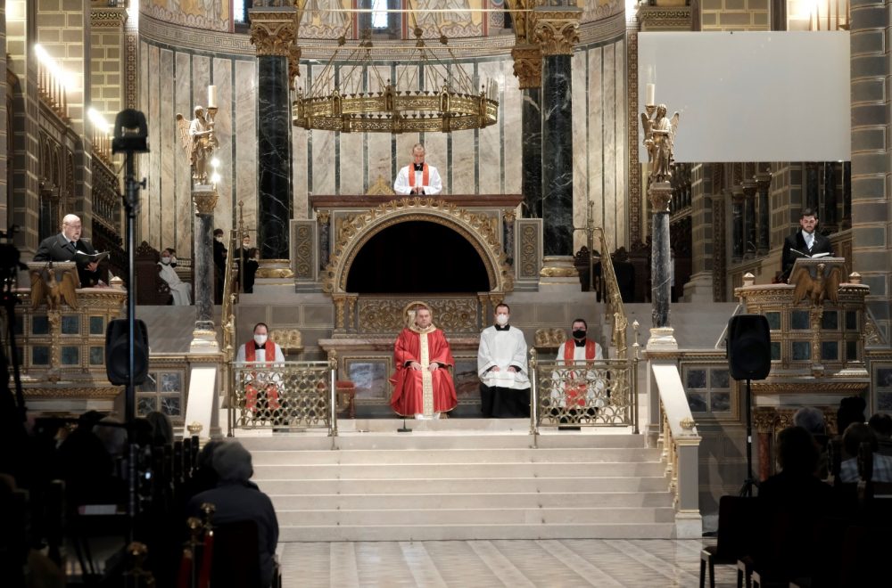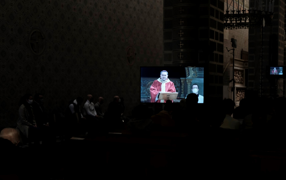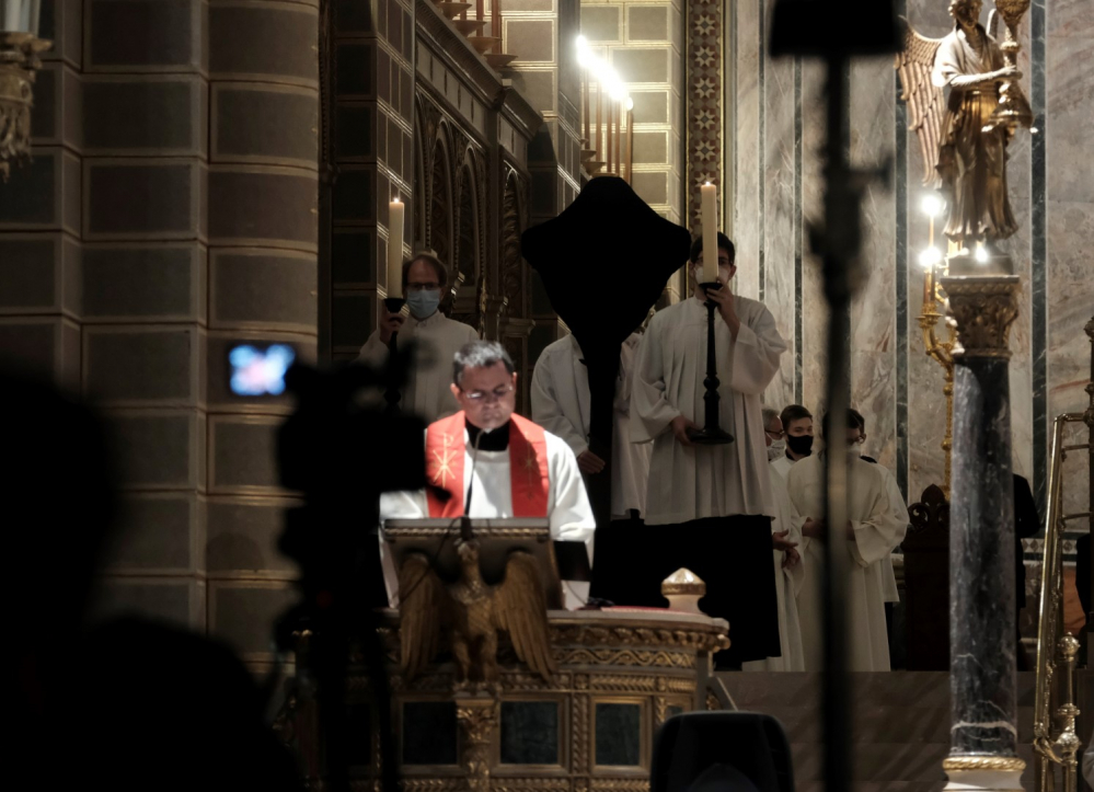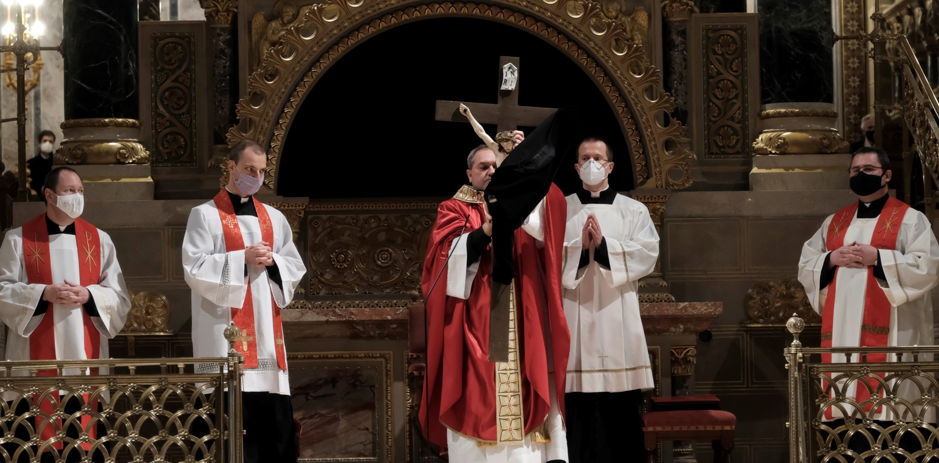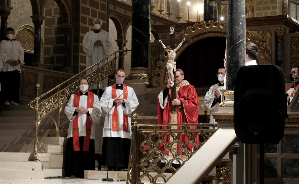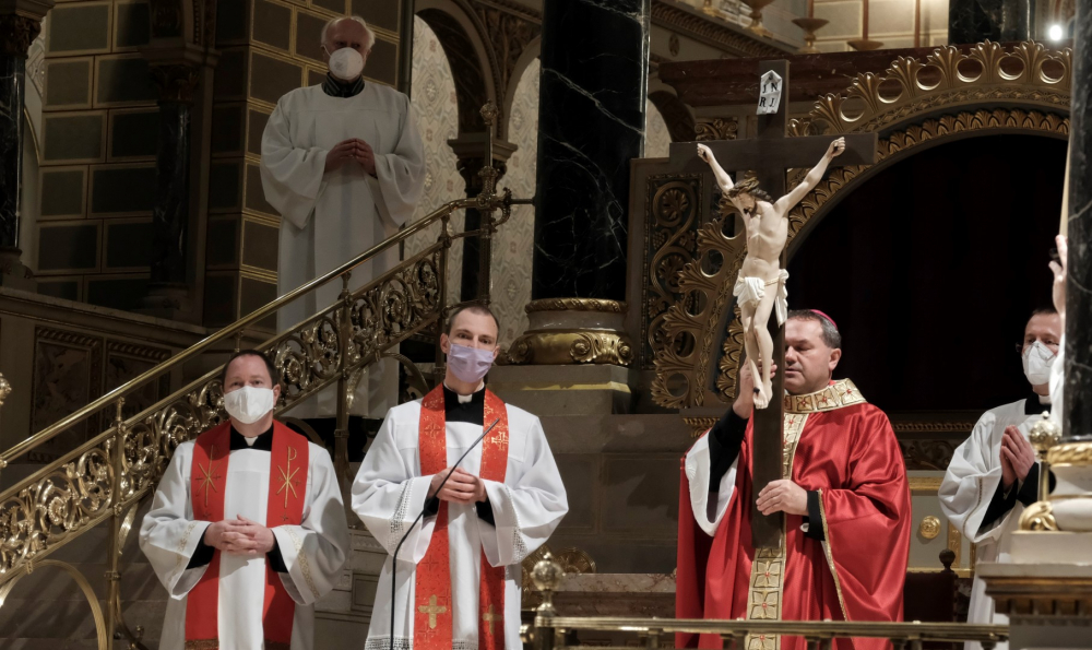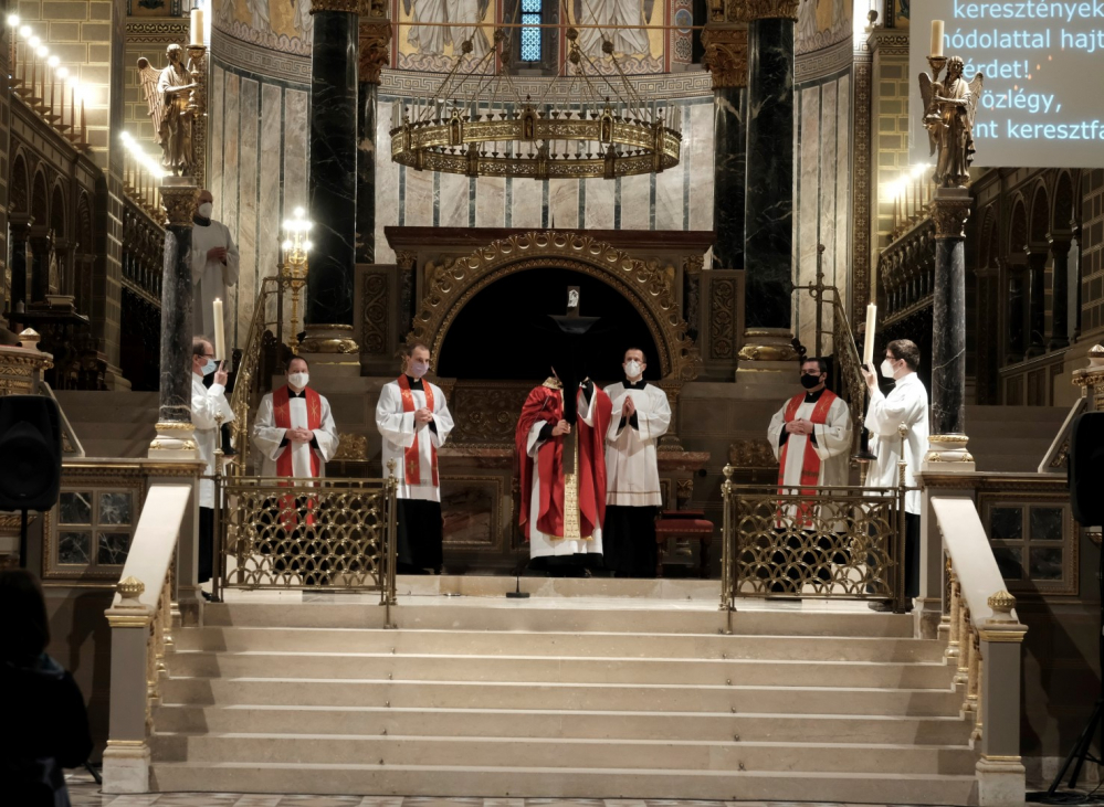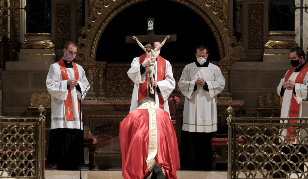 Urunk szenvedésének ünnepén a liturgia könyörgésselfolytatódott, mely abban tért el a megszokottól, hogy a megyéspüspök, a papság, az asszisztencia és a hívek a járványban megbetegedettekért, az elhunytakért, és a szeretteiket elvesztőkért külön imádkoztak. Ezt követően került sor a feszületet borító fekete fátyol levéltelére és a kereszthódolat megrendítő, ugyanakkor szép szertartására.Ennek során a jelenlévők egyként hajtottak térdet a kifeszített Jézus előtt. Végül a főpásztor csendben újra díszítette az előző esti, nagycsütörtöki szertartáson megfosztott oltárt, mire a szertartás kezdetén beszűrődő fény is elhalványult.