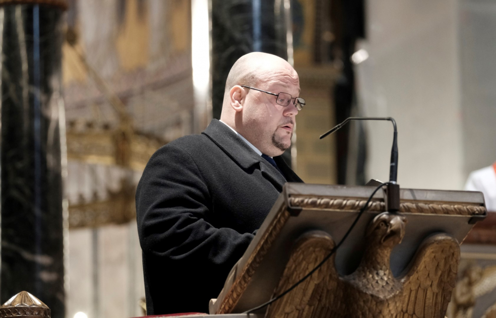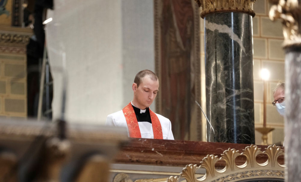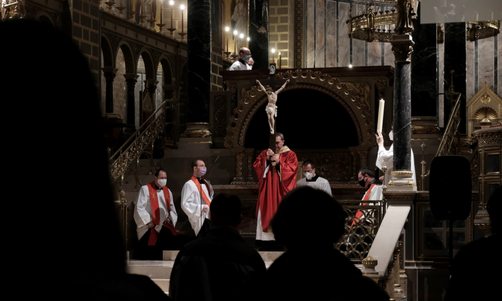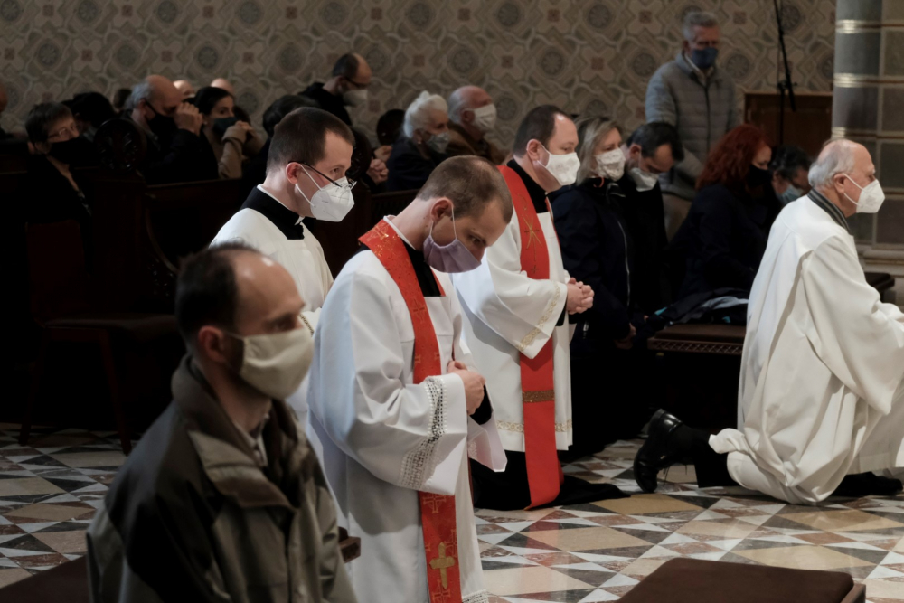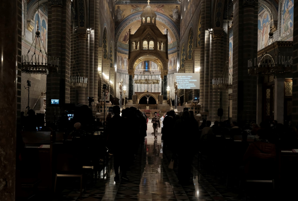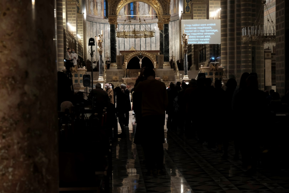 Csend, kevés fény, az ólomüvegeken átszűrődő napsugarak - így festett a Pécsi Bazilika belső tere április 2-án, 18.00 órakor. A nagypéntek esti liturgia néma csendben és amegfosztott oltár előtti leborulással vette kezdetét. Ezt követte az olvasmány, majd János evangéliumának (Jn 18-19) éneklése, mely emelkedettségében közelebb vitt Jézus szenvedésének történetéhez. A passió után Felföldi László pécsi megyéspüspök homíliájában rámutatott arra a kettősségre, miszerint a főpapok és katonák azért várták Jézus halálát, hogy ne éljen tovább; míg követői azért, hogy beteljesedjen az Írás. „Akkor ott senki nem gondolt arra, hogy ezzel a pillanattal bontakozik ki Isten és ember kapcsolatának valósága, hogy ezzel Isten terve, szeretetének túlcsordulása beteljesedik” – mondta a főpásztor és hozzátette, ekkor még a nép nem tudta, mit jelent elveszíteni, odaadni önmagukat, hogy megtalálják azt. Mint mondta, az ember szívében ellentmondást szül, hogy másokkal és ne a saját gondjaivaltörődjön; zavaró, hogy miért tartanak igényt ránk mások, holott éppen nekünk lenne szükségünk másokra. De Jézus halálával valami új veszi kezdetét, és amikor ránézünk a keresztre, merjünk szembe fordulni ezzel a gondolkodással.