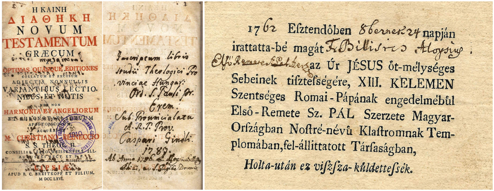[2] A kötet adatai: Hē Kainē Diathēkē. Novum Testamentum Graecum adjectis nonnullis variantibus lectionibus et notis nec non harmonia evangeliorum et chronotaxi actuum apostolicorum. Lipsiae, Apud B. C. Breitkopf et Filium, 1766. Őrzőhely: Pécsi Egyházmegyei Könyvtár – Jelzet: RA 960