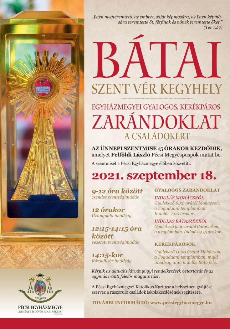 Nyolcadik alkalommal szervez gyalogos zarándoklatot a Pécsi Egyházmegye a Bátai Szent Vér kegyhelyre szeptember 18-án. Felföldi László pécsi megyéspüspök arra kéri a zarándoklat résztvevőit, hogy egyéni imaszándékaik mellett idén elsősorban a családokért imádkozzanak.