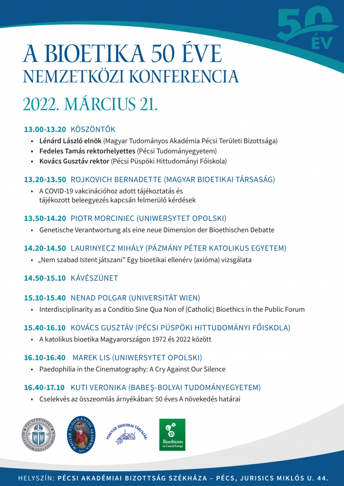 A bioetika 50 éve címet viselő konferencián magyar és külföldi előadók mutatják be a bioetika 1972 és 2022 közötti időszakát, főbb fejlődési vonalait és azokat a kihívásokat, amelyekkel az elmúlt fél évszázad során a bioetikának szembesülnie kellett. A témák között olyan, napjainkban aktuális témák szerepelnek, mint a COVID-19 vakcinához kapcsolódóan adott tájékoztatás és beleegyezés kérdésköre, a genetikai felelősségvállalás és a teremtésvédelem kérdése is.
