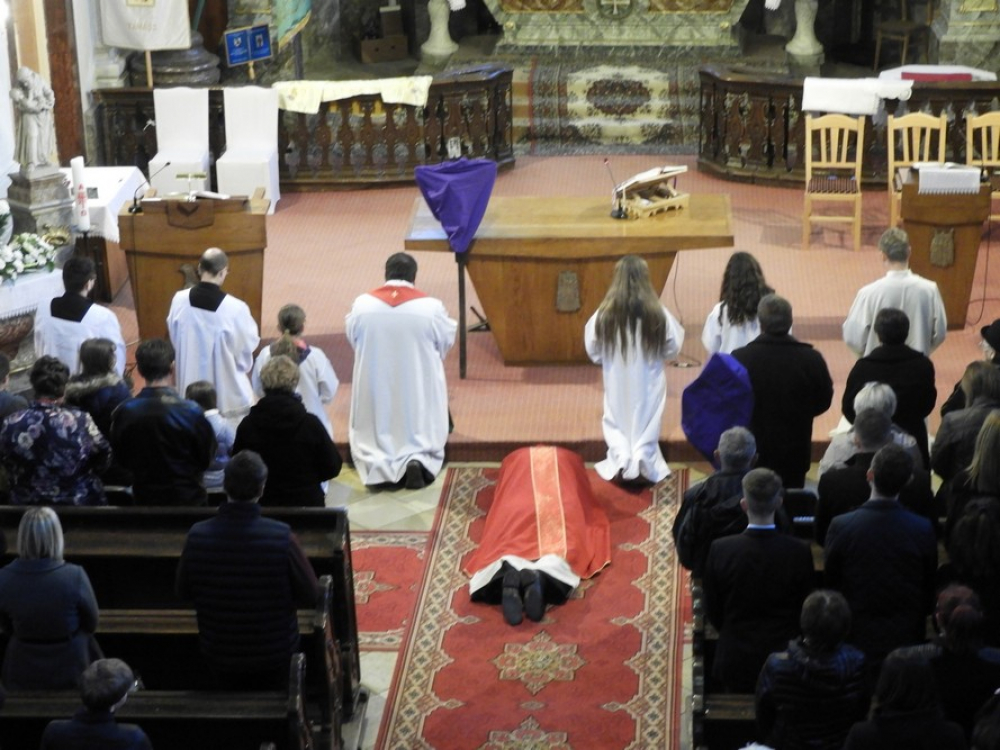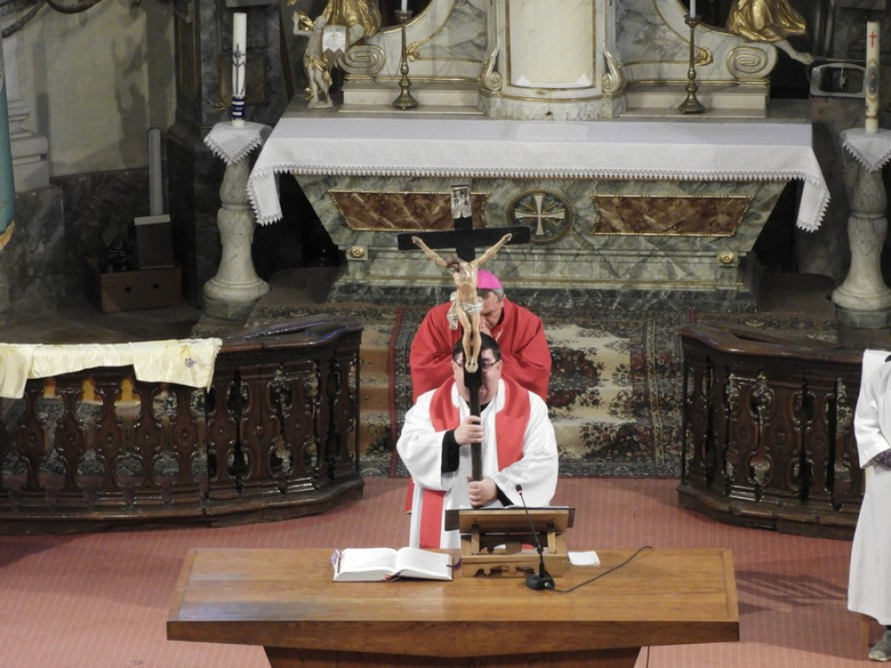 Nagypénteken egyházunk ősi hagyomány szerint nem mutat be szentmisét, a Jézust jelképező oltár díszek nélkül, csupaszon állt a Nagyboldogasszony-templomban is. A főpásztor, a plébános és az asszisztencia csendben vonult be, majd a püspök leborult az oltár előtt, jelképezve az önmagát kiüresítő Krisztust. Felhangzott a passió, Jézus Krisztus szenvedéstörténete Szent János evangélista tanúsága szerint, Csibi Imre plébános és az egyházközség híveinek előadásában.