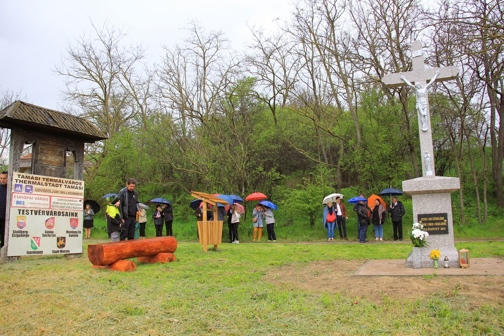 Tamásiban 2021 szeptemberében már állítottak keresztet a Nemzetközi Eucharisztikus Kongresszus emlékére a Miklósvári parkerdőben, a Szent Hubertus erdei fakápolna mellett. A közelmúltban pedig adakozásából felújításra került a Liget játszótér melletti kereszt is. A négy útmenti kőkereszt állításával tovább gyarapodott Tamásiban az útmenti keresztek száma.
