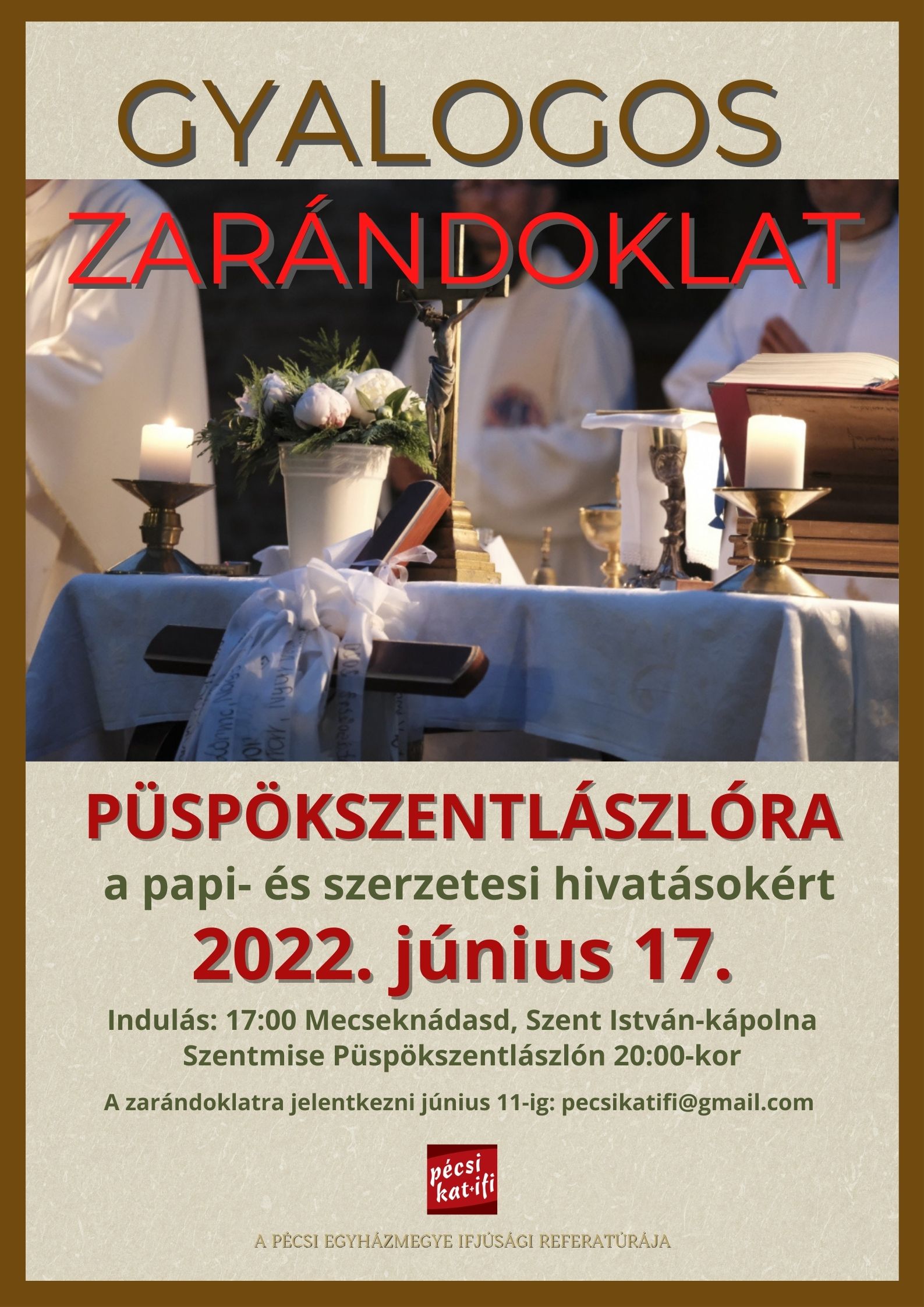 A Pécsi Egyházmegye Ifjúsági Referatúrája gyalogos zarándoklatra hív és vár mindenkit 2022. június 17-én, melyet a papi- és szerzetesi hivatásokért ajánlanak fel. A zarándoklat célja, hogy a résztvevők az imáik mellett az úton megtapasztalt élményeiket, leküzdött nehézségeiket is a hivatásokért ajánlják fel.
