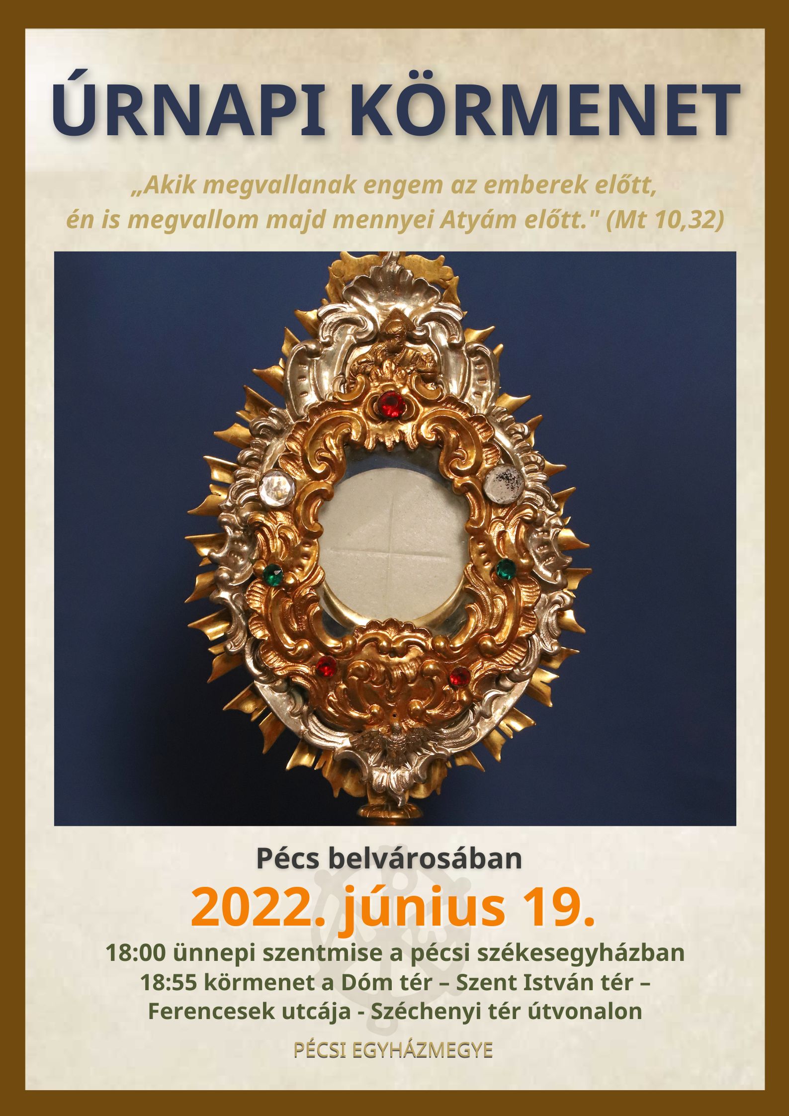 Az Eucharisztiában velünk élő Krisztust ünnepli a katolikus egyház úrnapján. Az ünnep alkalmából 2022. június 19-én, 18 órakor szentmisét mutat be a pécsi székesegyházban Felföldi László pécsi megyéspüspök. Az ünnepi szentmisét követően – a világ előtt is tanúságot téve a hitünkről és az egyházhoz való tartozásunkról - körmenetben kísérjük az Eucharisztiát a székesegyházból a Dóm tér, Szent István tér, Ferencesek temploma és az Irgalmasok temploma érintésével a Széchenyi téren álló Szentháromság-szoborhoz.