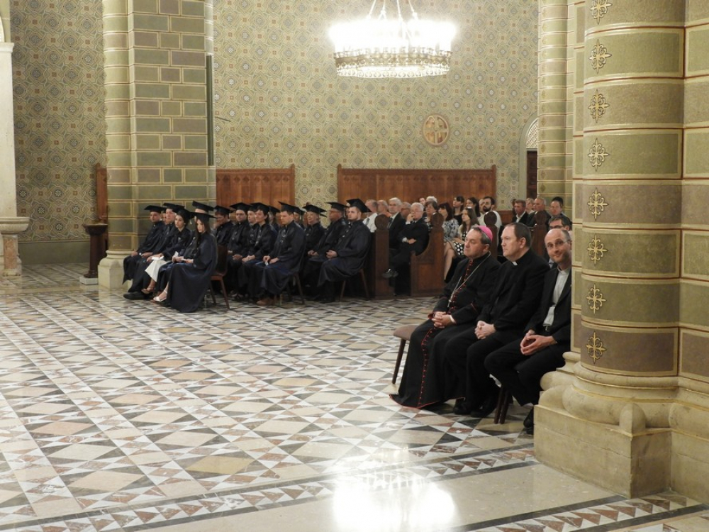 Az ünneplés folytatásában Dr. Kovács Gusztáv, a Pécsi Püspöki Hittudományi Főiskola rektora köszöntötte az intézmény végzőseit, tanárait és hallgatóit. Megköszönte az Pécsi Egyházmegyei Hivatal és Felföldi László megyéspüspök személyes támogatását, mely hozzájárult a főiskola fejlődéséhez, álmai megvalósításához. Az elmúlt akadémiai év eseményeit összefoglaló beszédében kiemelte, földi életünkben a teremtés nyitott, tele van lehetőségekkel, a mi feladatunk, hogy ebben részt vegyünk, emberhez méltóvá tegyük. A végzősök talárjához tartozó kalap vakolókanálra emlékeztető alakja ezt a világformáló feladatot szimbolizálja, melyre hittanárként, lelkipásztori munkatársként, szociális szakemberként a végzősök meghívást kaptak.