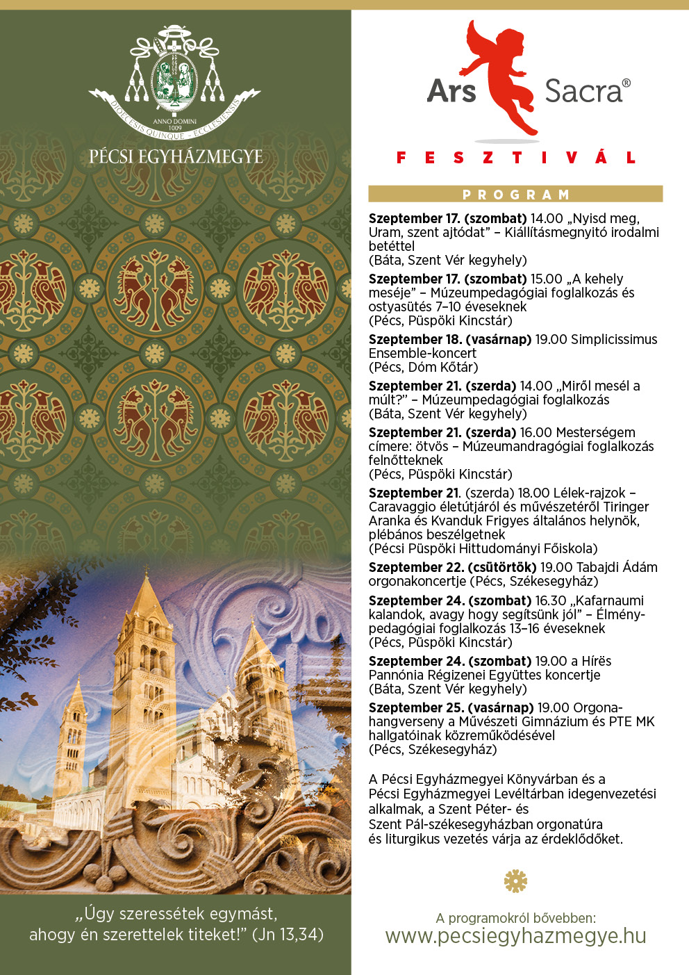 A korábbi évek hagyományát folytatva, az országos rendezvénysorozathoz kapcsolódva, a Pécsi Egyházmegye idén is megrendezi az Ars Sacra Fesztivált. A rendezvénysorozat szeptember 17-én ünnepélyes kiállításmegnyitóval kezdődik a bátai Szent Vér kegyhelyen és orgonahangversennyel zárul szeptember 25-én a pécsi székesegyházban. Az egyházművészeti fesztivál idei mottója: „Úgy szeressétek egymást, ahogy én szerettelek titeket.” (Jn 13,34).