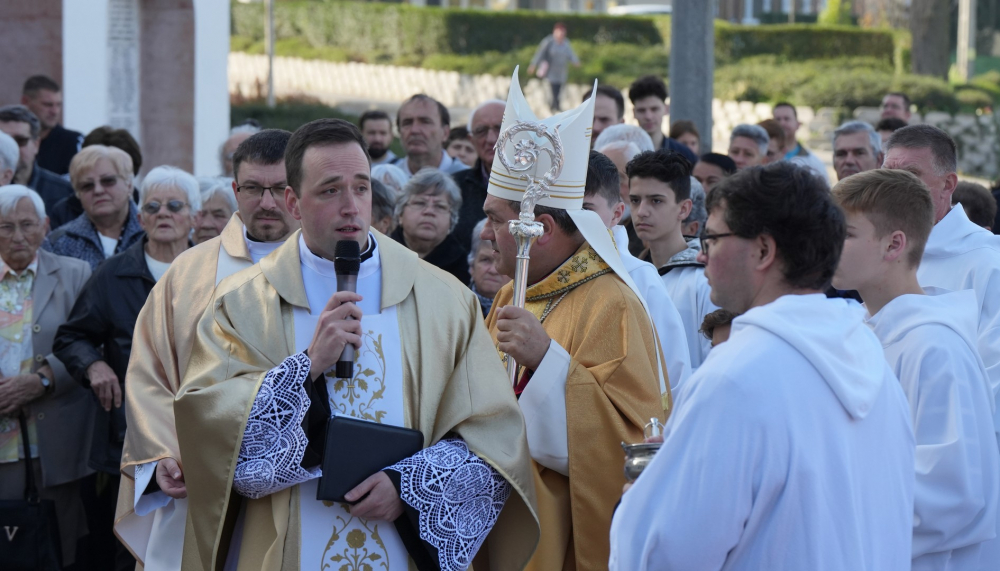 Rendhagyó módon a templom előtti téren gyülekeztek ünnepi szentmisére a hívek Komlón, ahol Dallos Tamás plébános köszöntötte a megjelenteket. Köszönetet mondott a kormányzati támogatásból, valamint a hívek közösségének nagylelkű adományaiból megvalósult munkálatokért, és felkérte Felföldi László pécsi megyéspüspököt a templom és a közösség meg áldására, majd a liturgia a templomban folytatódott.