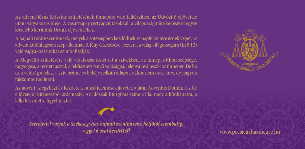 A székesegyházban bemutatott roráté szentmiséket a Pécsi Egyházmegye YouTube-csatornáján élőben közvetítjük. A napi roráté szentmiséken hallható szentbeszédek főbb üzenetét Adventi gondolatok címmel naponta közzétesszük a Pécsi Egyházmegye honlapján és Facebook-oldalán.