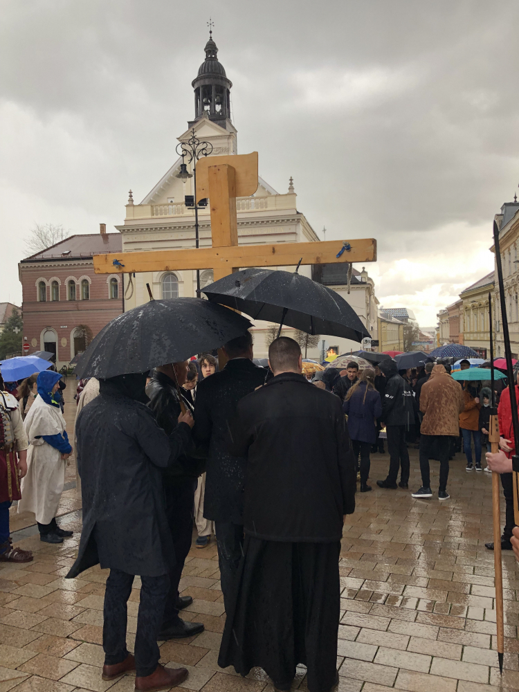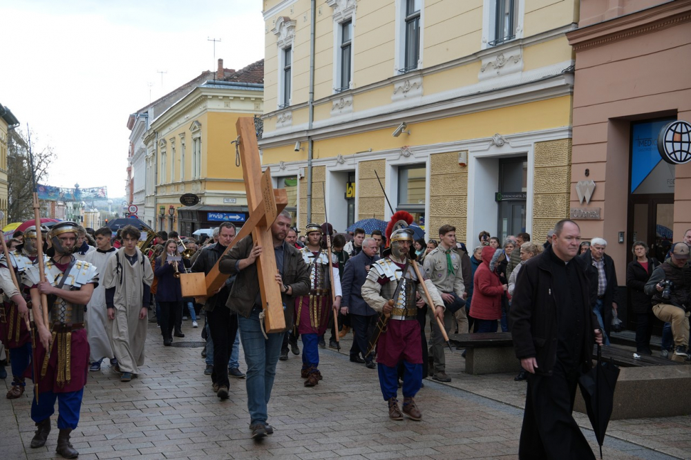 Az időjárás idén is bolondját járatta velünk, legalábbis Pécsett, emlékezetessé téve a városi keresztutat. A települést és környékét ugyanis április 1-jén, a késő délutáni órákban egy erős zivatartömb érte el, melyet felhőszakadásszerű csapadék és borsó nagyságú, kiadós jégeső kísért. Hiába az időjárás-előrejelzések gondos tanulmányozása, a belváros utcáira tervezett keresztút jégeső áldozata lett. Azaz lett volna, ha a szervezők leleményességének köszönhetően az Irgalmasok templomában Isten háza irgalmába nem fogadja a keresztutat és a résztvevőket.
