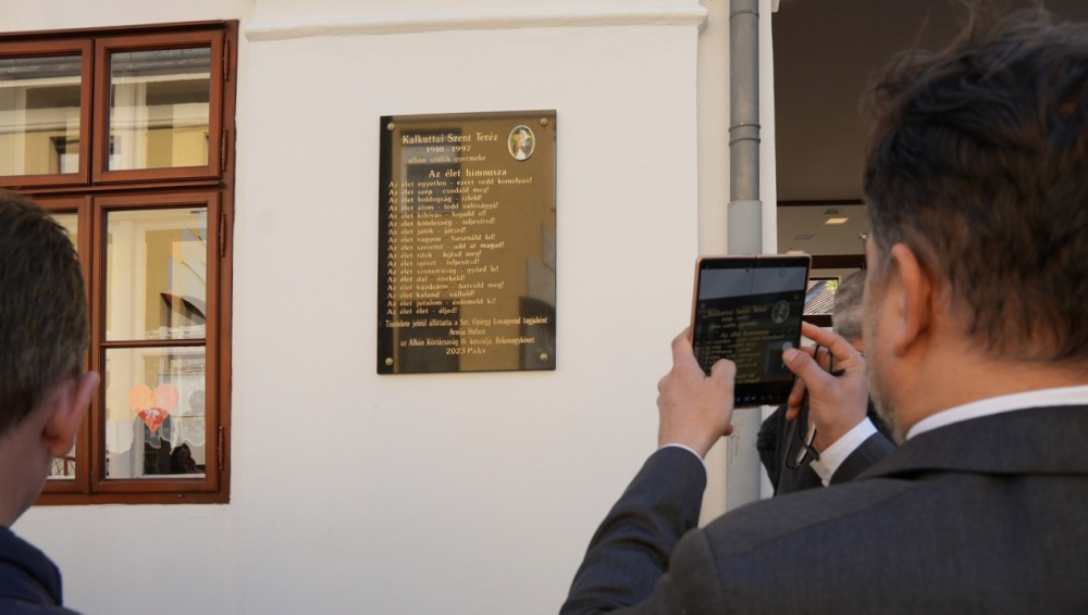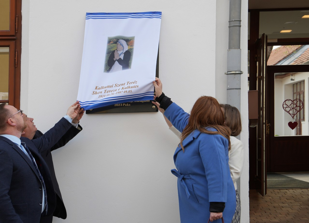 Az óvoda bejárata melletti homlokzaton elhelyezett emléktáblát a püspöki áldást követően Gentiana Mburimi, az Albán Köztársaság budapesti nagykövetségének ügyvivője, Szabó Péter Paks polgármestere, Hafuzi Avnija, az Albán Köztársaság tiszteletbeli konzulja és Heszné Rauth Ildikó, a Kalkuttai Szent Teréz Óvoda intézményvezetője leplezte le.