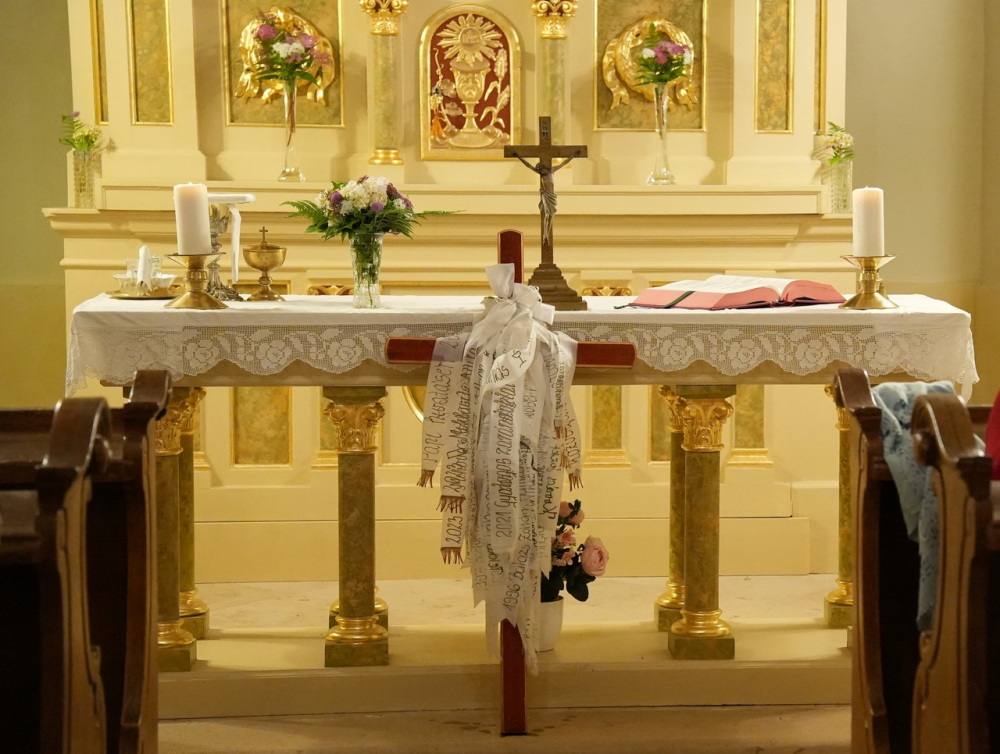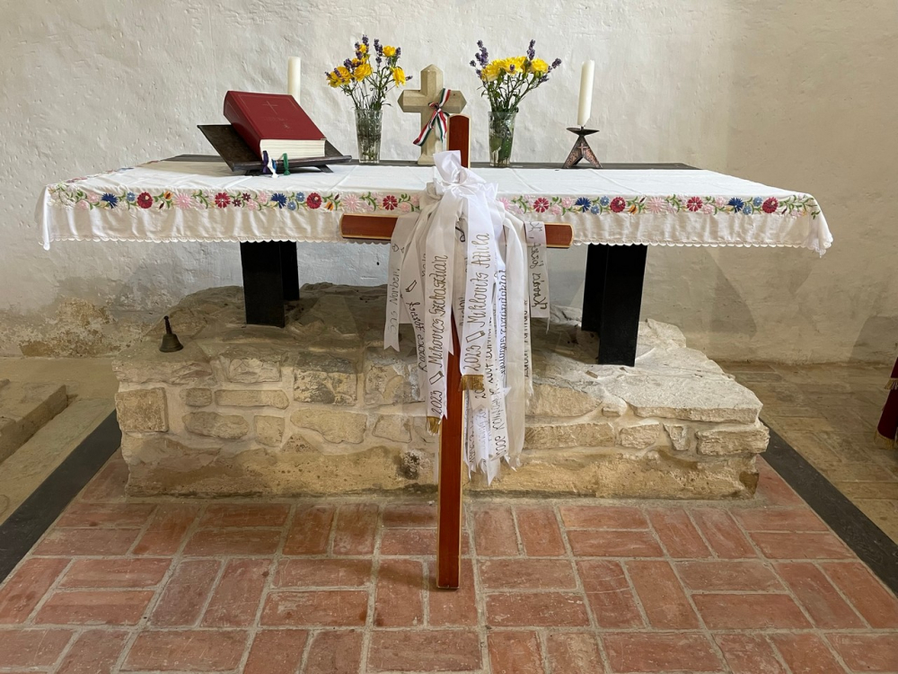 Életünkben folyamatosan úton vagyunk, felgyorsult világunkban szüntelenül rohanunk valahová – hangsúlyozta szentbeszédében Dallos Tamás komlói plébános, akinek a neve szintén fel van írva a zarándokkereszt egyik szalagjára –, ugyanakkor sehol sem vagyunk ott igazán. Ma zarándokúton vagyunk, ami lényegileg más, mint a mindennapok céltalan rohanása, mert pontos értelme van. Ezen a földön nincs maradandó hazánk, az eljövendő hazánk után vágyakozunk (vö. Zsid 13,14). Az Ószövetségben láthatjuk, például az egyiptomi kivonulás történetében, hogy Isten és ember kapcsolata gyakran hosszú úton, vándorlás folyamán alakul ki, lép bensőségesebb szintre. Isten együtt járja népével a vándorutat, vele van és megoltalmazza, célt és irányt ad haladásuknak. Saját életünkben ugyanezt a feszültséget, keresést, várakozást hordozzuk. Várjuk Isten útmutatását az állandó haza felé vivő úton. Jézus azt mondja, azért megy vissza az Atyához, hogy helyet készítsen számunkra (vö Jn 14,2).