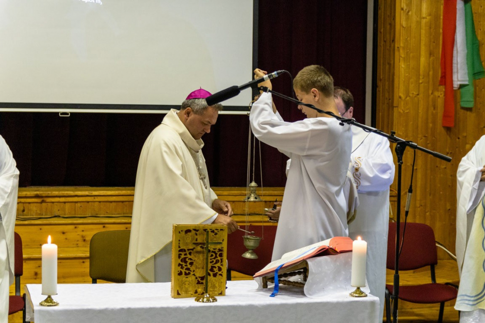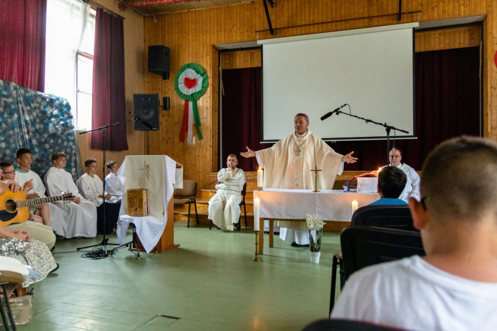 16 órakor Felföldi László pécsi megyéspüspök atya mutatott be szentmisét, melyet ministránsfélóra előzött meg. Ennek keretein belül püspök atya előadást tartott az általa használt liturgikus eszközökről; elmondta, hogy mi ezeknek a funkciója a püspöki szentmisén. A ministránsok feltehették kérdéseiket a püspök atya számára, aki nagy örömmel, készségesen meg is válaszolta ezeket. A szentmise utáni programon a vihar miatt változtatni kellett, az esti program a szerdaihoz hasonlóan filmnézés lett: az esti ima után A mennyei csodák című filmet tekintették meg a gyerekek.