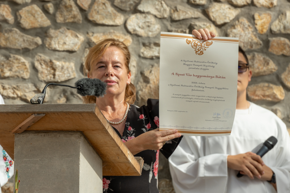A zarándoklat alkalmából az ünnepi szentmise keretében adták át azt az oklevelet és üveg plakettet, mely azt tanúsítja, hogy a Szellemi Kulturális Örökség Magyar Nemzeti Bizottság javaslata alapján, Csák János innovációs és kulturális miniszter jóváhagyása mellett, a Szent Vér hagyománya Bátán 2023. szeptember 15. napján felvétetett a Szellemi Kulturális Örökség Jegyzékére. A Nemzeti Jegyzékre vétel megerősíti a közösségi kultúra védelmének jelentőségét, a kulturális örökség megőrzésének nemzeti szintű elismerését. A Szellemi Kulturális Örökség Magyarországon emlékplakettet Sümegi József diakónus, a bátai Szent Vér kegyhely őre vette át.