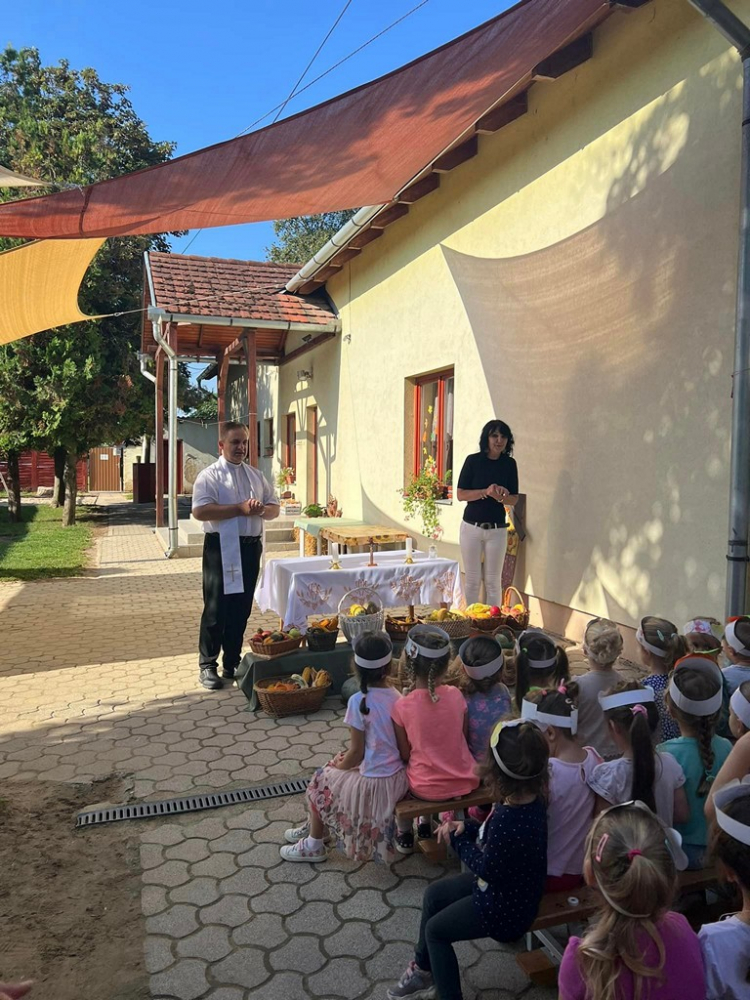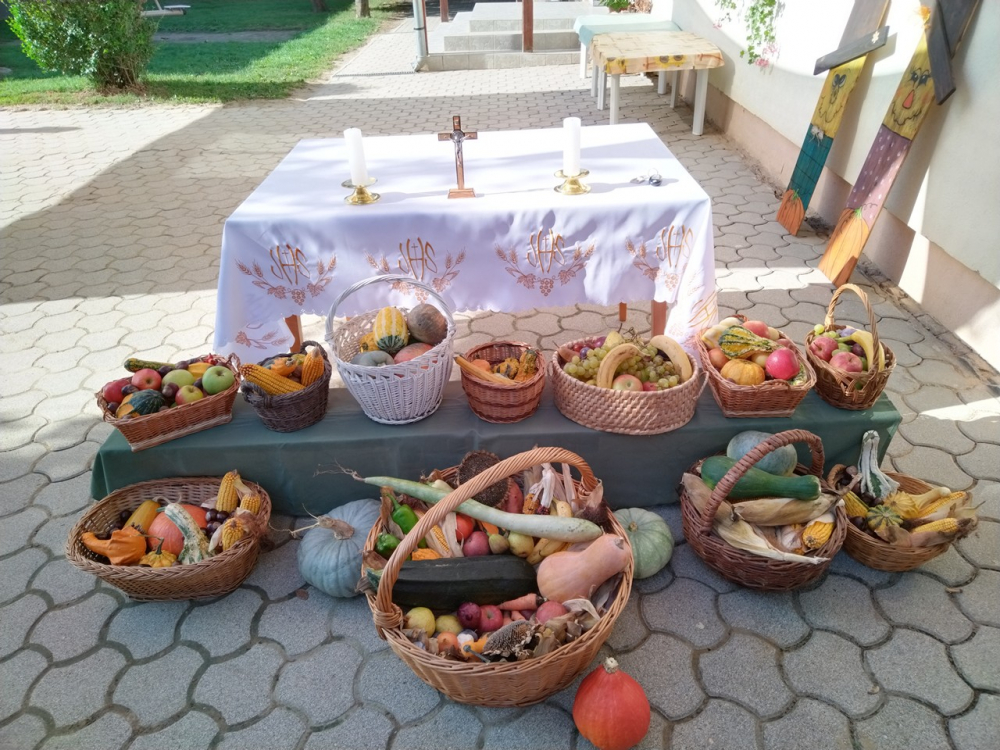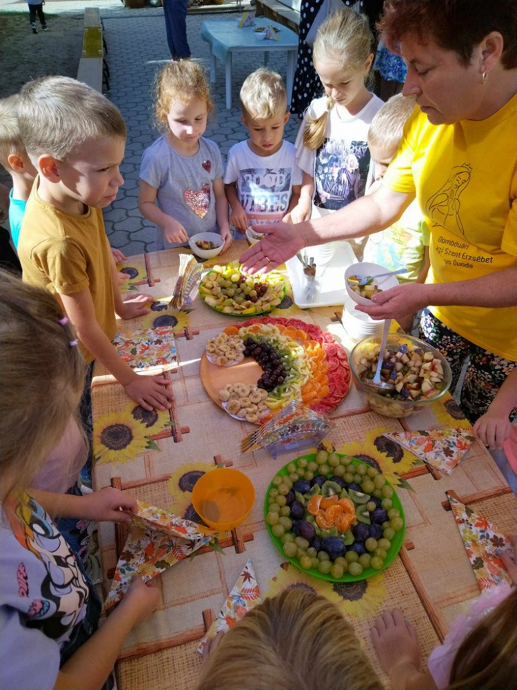 Az ünnephez kapcsolódóan az intézmény Erntedankfest rendezvényt is szervezett, melynek keretében dr. Hegedűs János atya megáldotta a csoportok által összegyűjtött terméseket, a gyerekek által készített egészséges, gyümölcsfalatkákat. A német nemzetiségi Holdacska csoport által bemutatott táncokat nagyon élvezték a gyerekek.