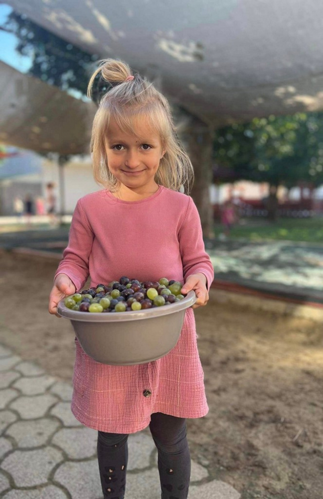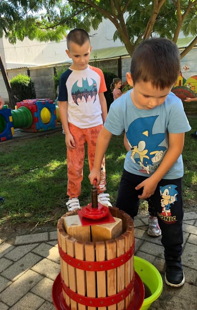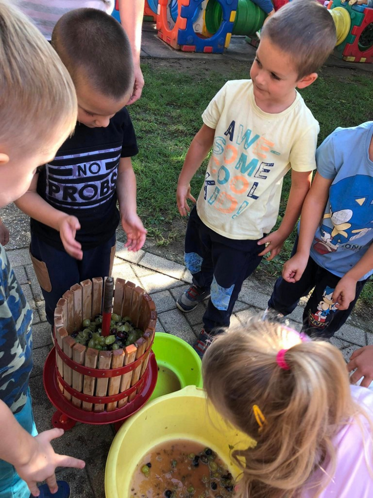A hét közepén, szüreti mulatság várta az óvoda kis lakóit. A szőlőfürtök szemezése, préselése után az elkészült finom mustot meg is kóstolták. Ügyes kezek morzsolták a kukoricát, törték a diót, mogyorót. Az óvodapedagógusok célja volt az ősz szépségeinek, terményeinek, időjárásának megfigyelése, megismertetése, a gyermekek számára, egyéni- és életkori sajátosságaikhoz igazodó tevékenységközpontú tanulás, élményekhez juttatás biztosítása által.