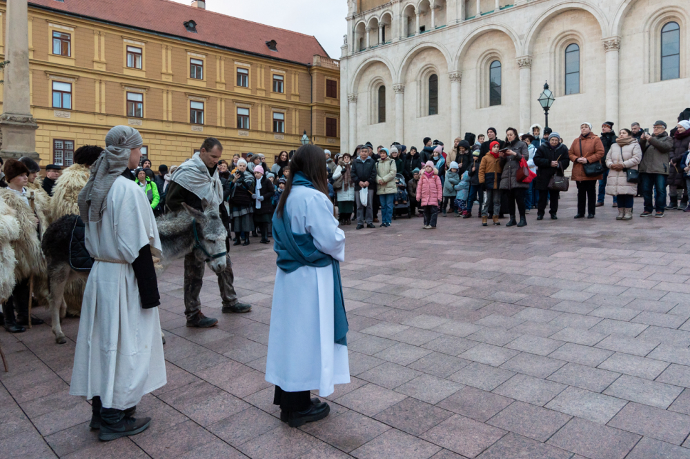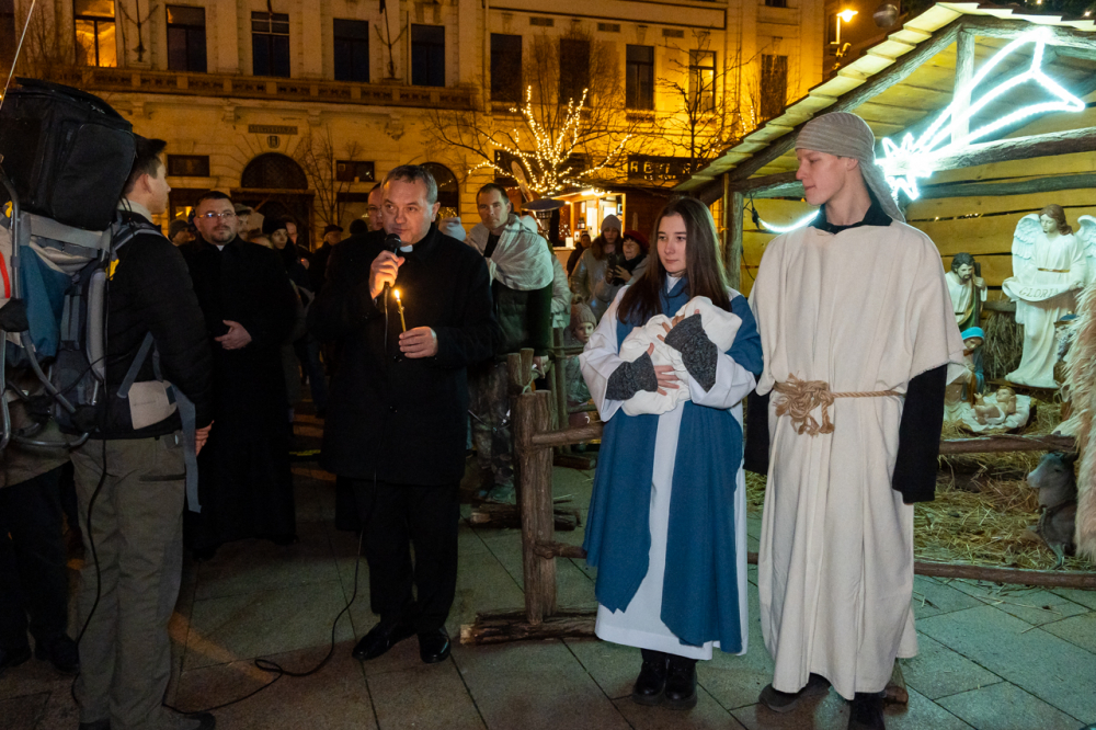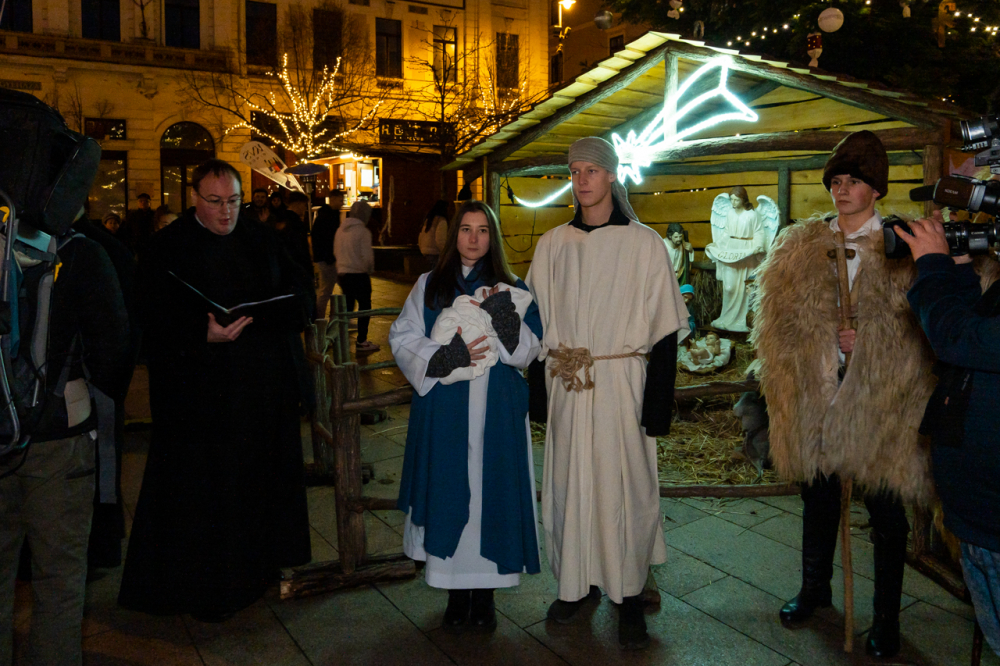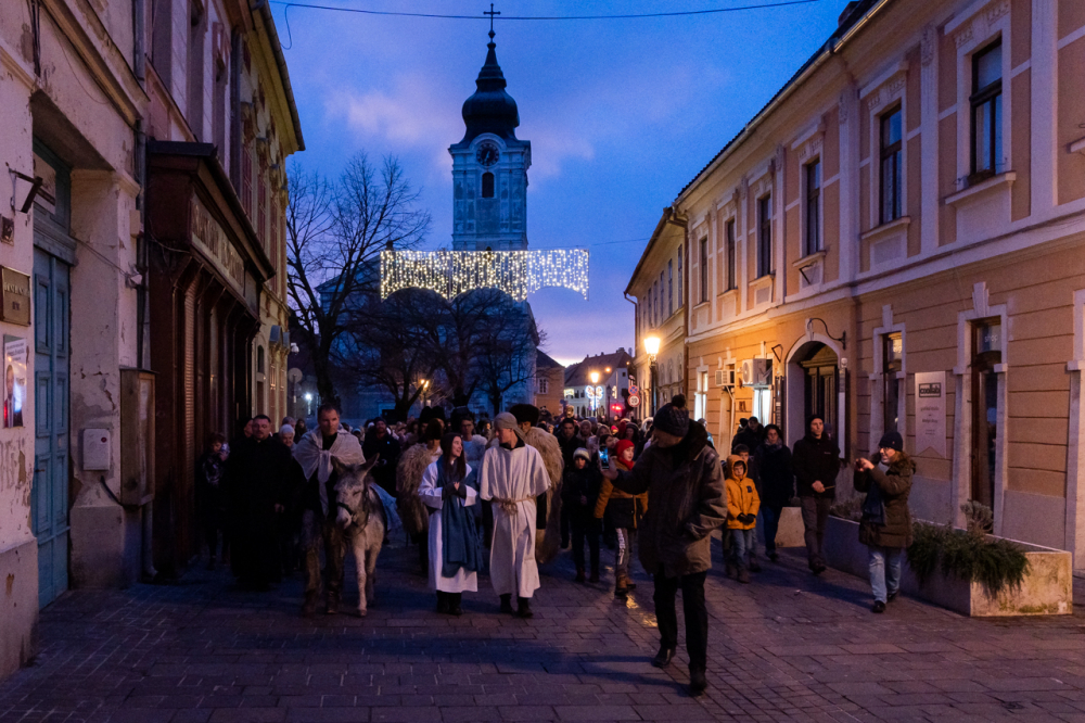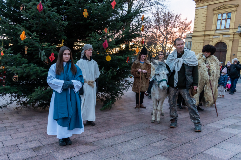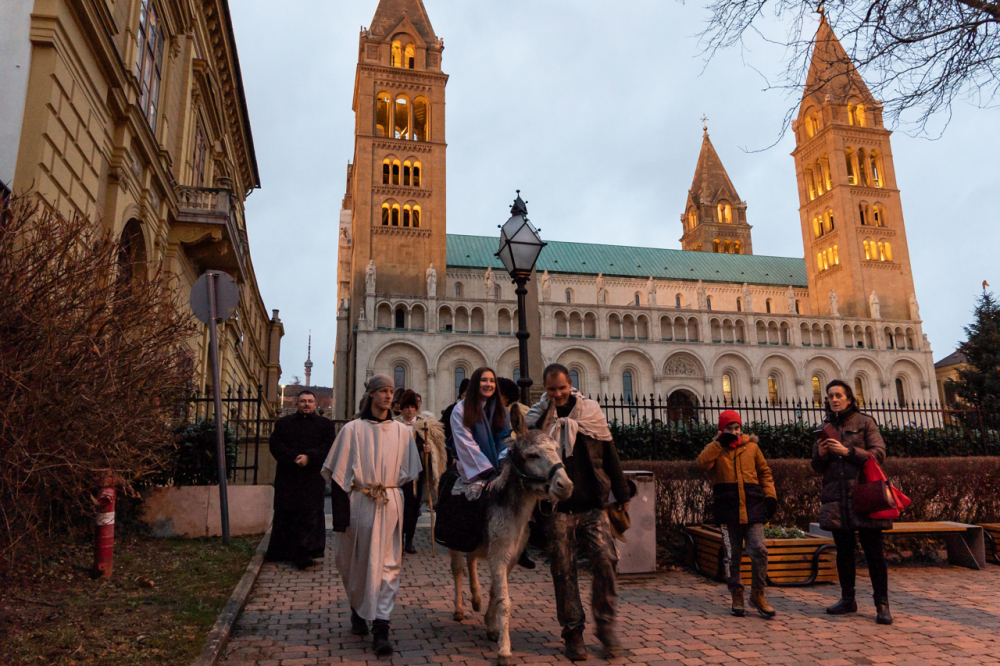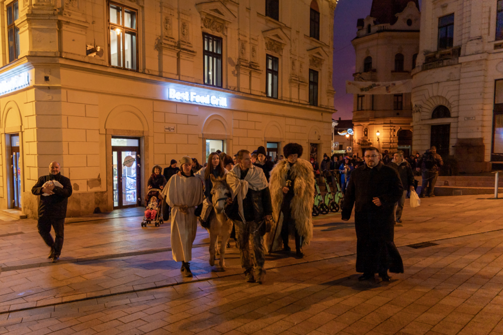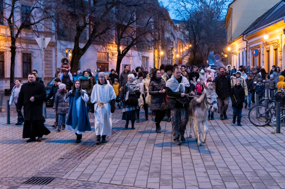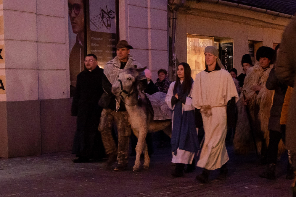 A júdeai Betlehemben szállást kereső Szent Család, Mária és József alakját megszemélyesítő fiatalok és az őket kísérő menet énekes-zenés ájtatosságban idézte fel a születés éjszakáján történteket december 23-án este Pécs belvárosában.