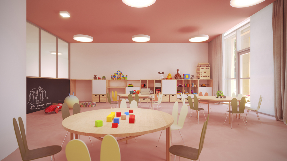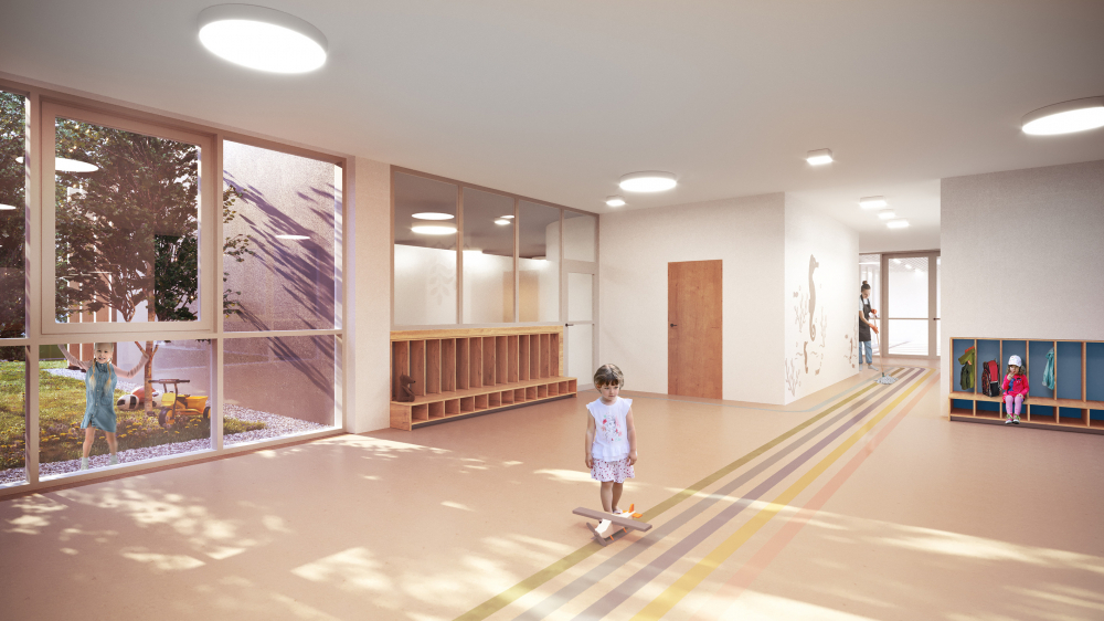 Az aulától délre helyezkedik majd el a 4 csoportszoba, a tornaszoba és a foglalkoztatók. Minden csoportszobához tartozik saját raktár, öltöző és vizesblokk is.