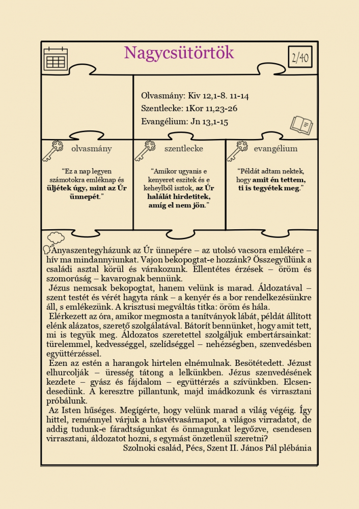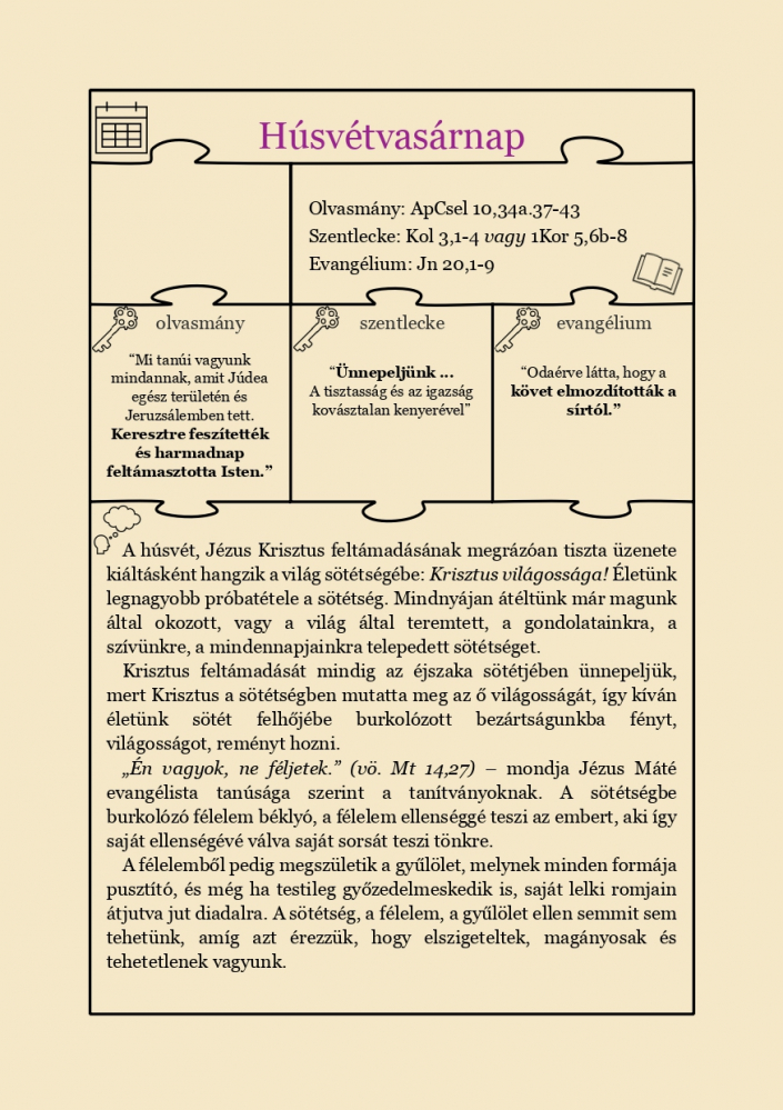 A 74 oldal terjedelmű kiadványban ezúttal is grafikai jelek igazítanak útba a napi szentmise szentírási szakaszai, egyházmegyénk lelkipásztorainak gondolatai, egyházközségeink családjainak rövid tanúságtételei és a napi imádságok között, melyek abban nyújtanak segítséget, hogy húsvétkor valóban megéljük a feltámadott Krisztussal való találkozás örömét.