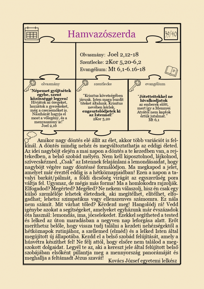 A Pécsi Egyházmegye, a Pécsi Püspöki Hittudományi Főiskola és a PEKEL közös kiadványa a szerkesztők szándéka szerint azzal a céllal született, hogy segítse az olvasót a nagyböjti időszakban, hamvazószerdától kezdve a nagyhéten át egészen húsvétig, Krisztus szenvedésének és feltámadásának ünnepére felkészülni.