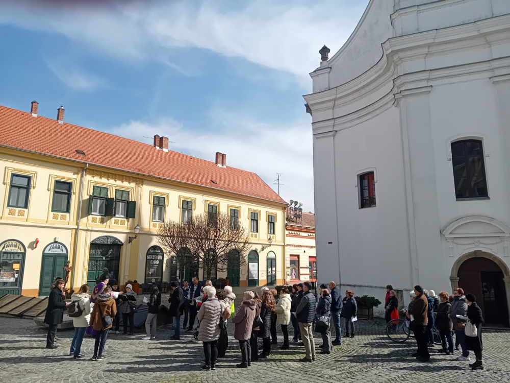 Volt állomás a hősi emlékműnél, a város ikonikus szobrainál, az elhurcolt zsidó honfitársaink emléktáblájánál és a már elbontott rác templom helyén is. A BázisPont családi centrumnál pihenőt tartottunk. Innen már csak a jobb kondícióban lévők folytatták az utat. A turbéki temetőtől a turbéki kegyhelyig már borús ég alatt, hűségesen imádkozva vonult a csoport kereszttől keresztig a régi búcsúsok útvonalán.