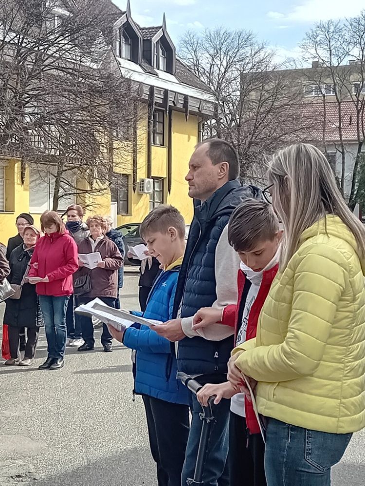 Ragyogó napsütésben indultunk a város főteréről délután 1 órakor. A keresztút első fele a városközpontban haladt, ezen a szakaszon az egyházi közösségek több idős tagja és kisgyermekes családjai is részt tudtak venni, és mintegy ötvenen kapcsolódtak be hosszabb-rövidebb szakaszokra a keresztútba.