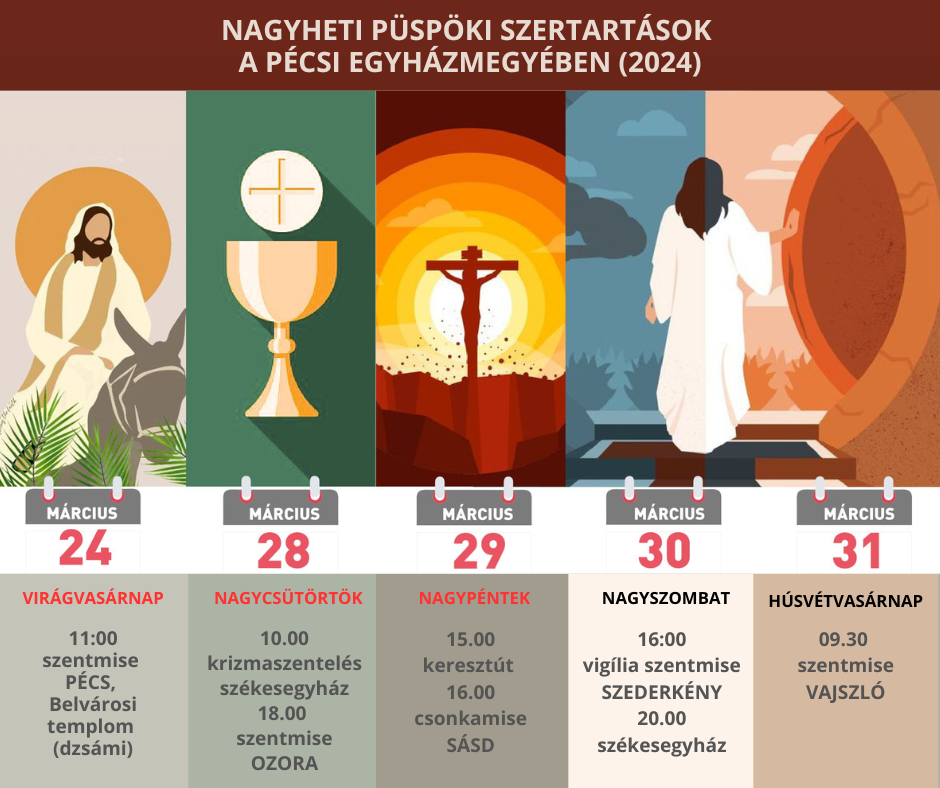 Felföldi László pécsi megyéspüspök az alább felsorolt időpontokban és helyszíneken mutat be szentmisét, illetve vezet szertartást virágvasárnap és a nagyhéten a Pécsi Egyházmegyében: