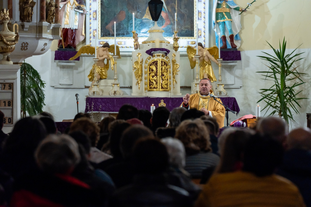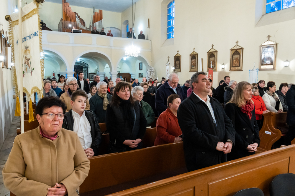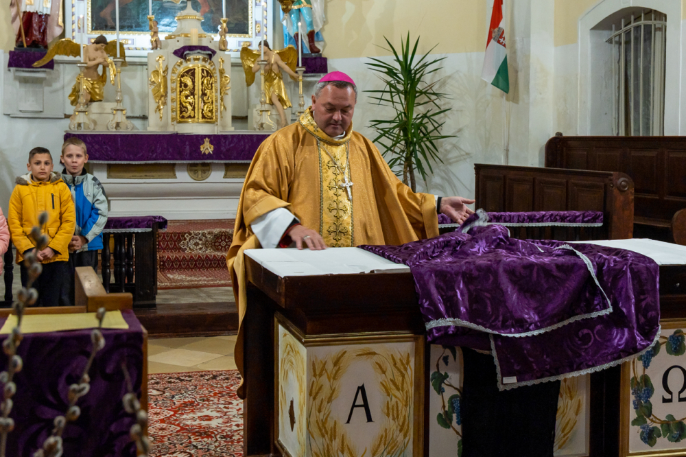 Felföldi László köszöntőjében kifejezte örömét a hívekkel való találkozásért és szeretettel üdvözölte a megjelenteket, külön a fiatalokat és a gyermekeket. Kifejezte háláját, amiért a kis település lakói megőrizték és megtartották a hitüket.
