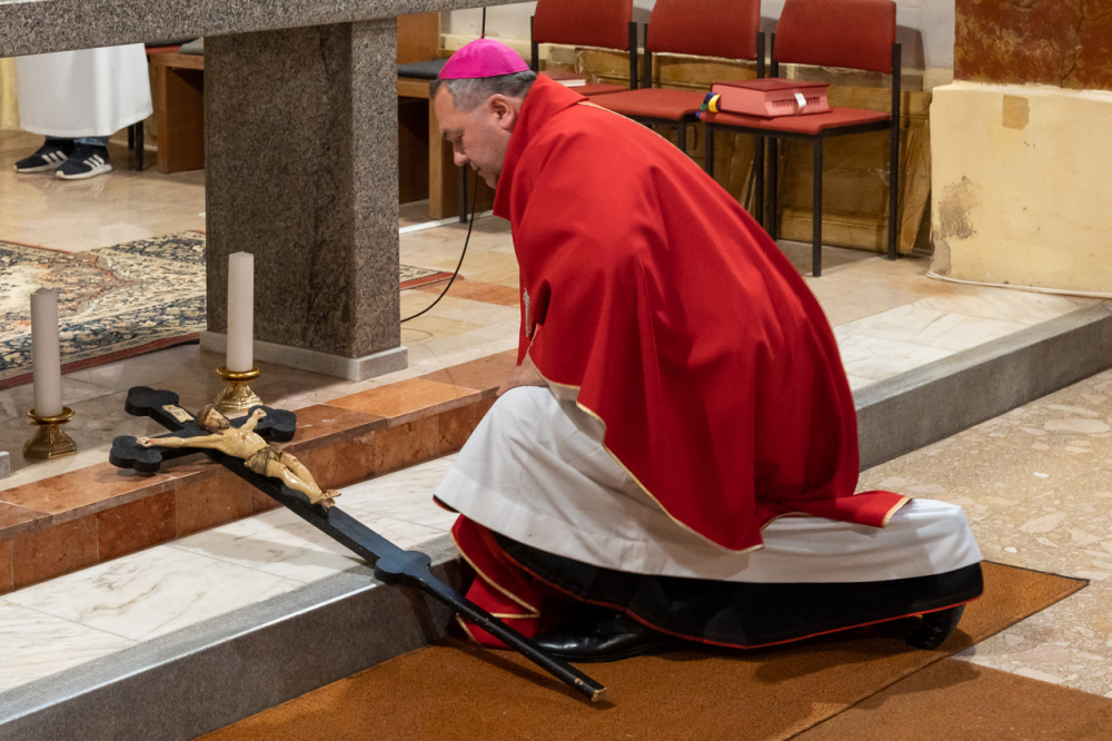 Nagypénteken egyházunk ősi hagyomány szerint nem mutat be szentmisét, a Jézust jelképező oltár díszek nélkül, lecsupaszítva állt a Kisboldogasszony-templomban is. A főpásztor és az őt kísérő papnövendékek csendben vonultak be a templomba, majd a püspök és a diakónus leborult az oltár, az önmagát kiüresítő Krisztus jelképe előtt.